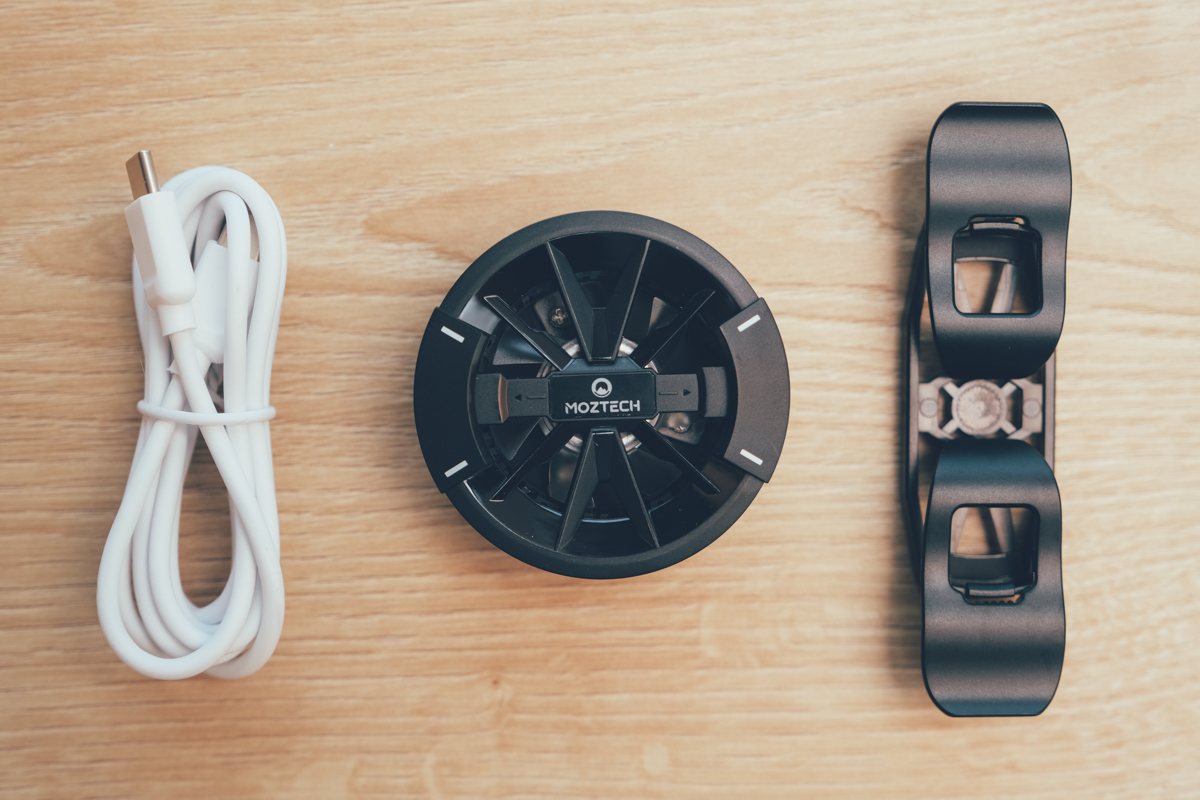 內附標配是一組冰能充磁吸無線充電板、USB-C 充電線以及一組擴充伸縮夾(可以適用各種不支援 Magsafe 的智慧型手機使用)。