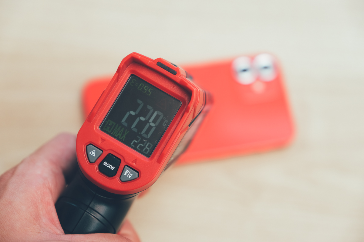 接下來我們來看一下裝上冰能充無線充電板一樣玩 20 分鐘遊戲,測到的溫度是 22.8 度!!!還是邊充電的的機背溫度,跟剛剛足足差了 13 度左右,而且阿湯其實後續持續玩了 1 小時後,溫度不論怎麼測都一樣是 22 度左右,保持著非常穩定的散熱能力。