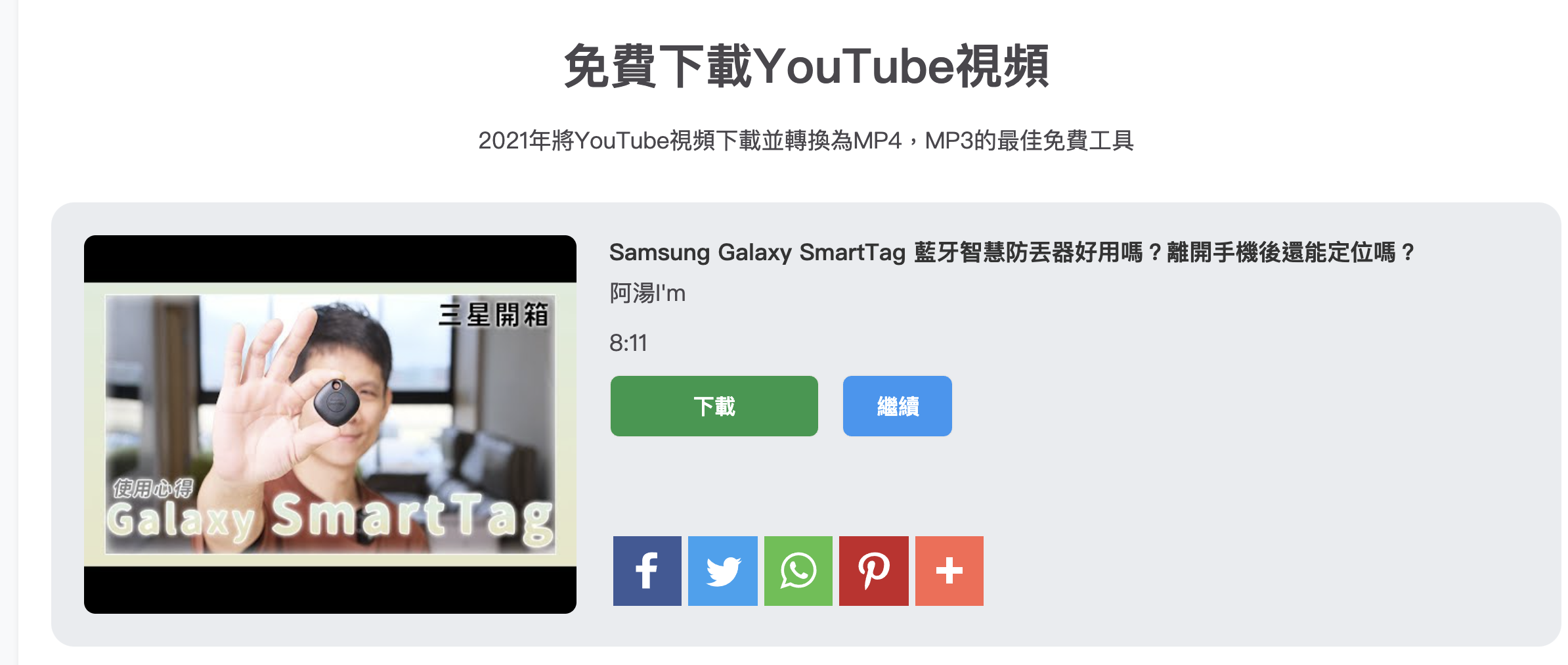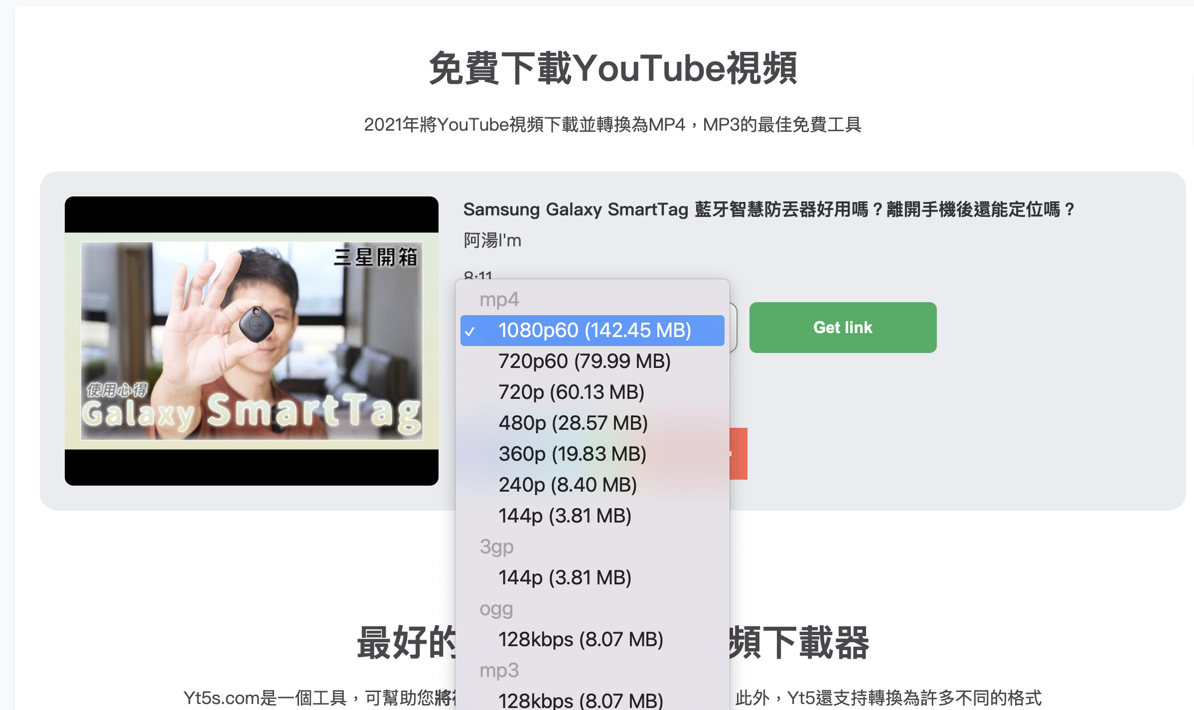 首頁 › 線上工具/服務 › YT5s - YouTube 下載工具,支援 1080p 檔案下載,也可以下載為 MP3 YT5s - YouTube 下載工具,支援 1080p 檔案下載,也可以下載為 MP3 發佈日期:2021/11/5 作者:阿湯 分類:線上工具/服務 今天又來分享一個下載 YouTube 很方便的工具,叫做 YT5s,會介紹主要是可以支援 1080p 的解析度下載,雖然現在 YouTube 影片下載工具很多,但線上服務普遍都只支援到 720p,到 1080p 以上的比較少見,因為無法直接抓到 YouTube 的原始檔案,需要透過轉檔的方式才可以,試用了一下廣告算少,也還不錯用,就大家趁能用就用吧,因為這類服務通常壽命不太長。 YT5s - YouTube 下載工具 網址:https://yt5s.com/zh-tw11 進入網站後,直接在搜尋框貼上想要下載的 YouTube 影片。 然後就可以選擇下載的解析度還有格式了,直接點擊 Get link 就會開始轉換。 等轉換完畢後,就直接按下載,唯一有廣告的地方就是這裡,按下載時會跳一個新分頁,這是廣告,第二次按下載才是真的。