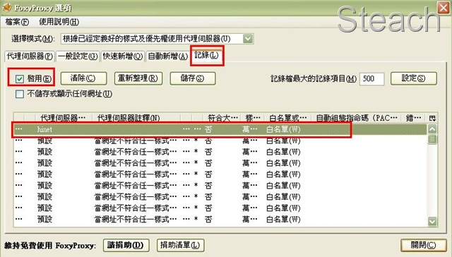 如果想知道到底有沒有作用,可以在記錄頁中,啟用記錄,就會得知啟用了哪些代理的設定哦,這個時候就來說明一下站長前面提到的預設設定,這個預設是指,除了你指定的樣式網址使用代理伺服外,其餘皆直接連結不掛代理的預設,你點擊那個預設進去觀看設定,就了解站長的意思囉!!