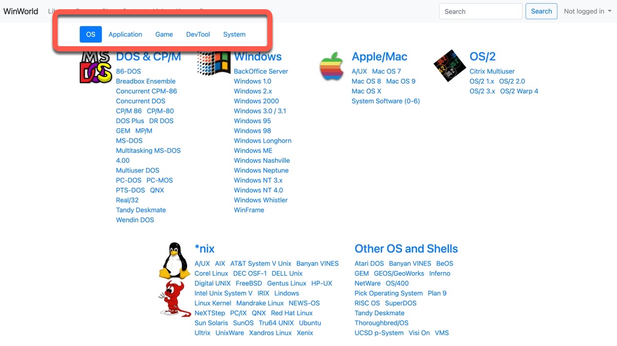 進入 Library 裡後,上方主要分為作業系統、應用程式、遊戲、開發工具及系統等,像作業系統裡真的是太經典,基本上所有老舊的系統版都有。