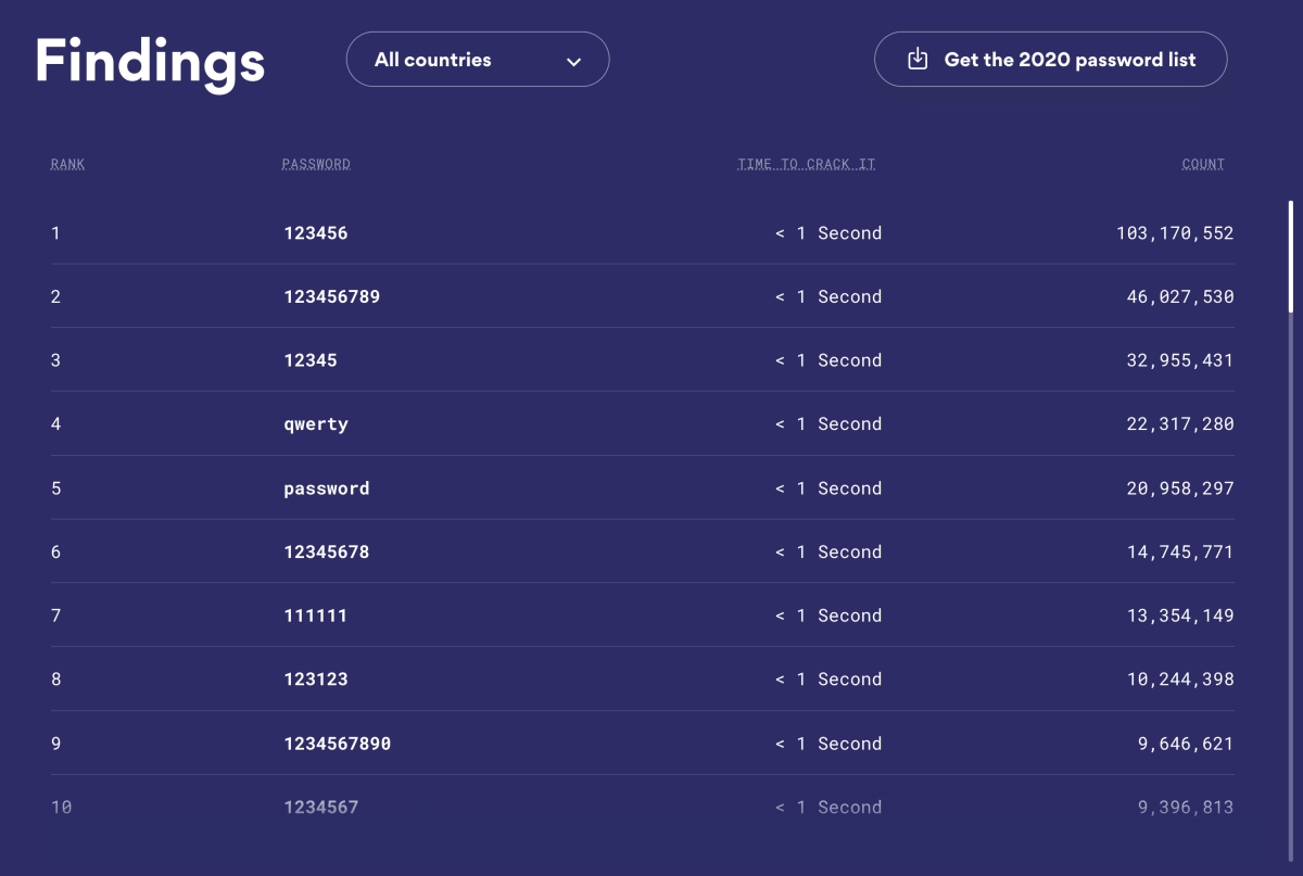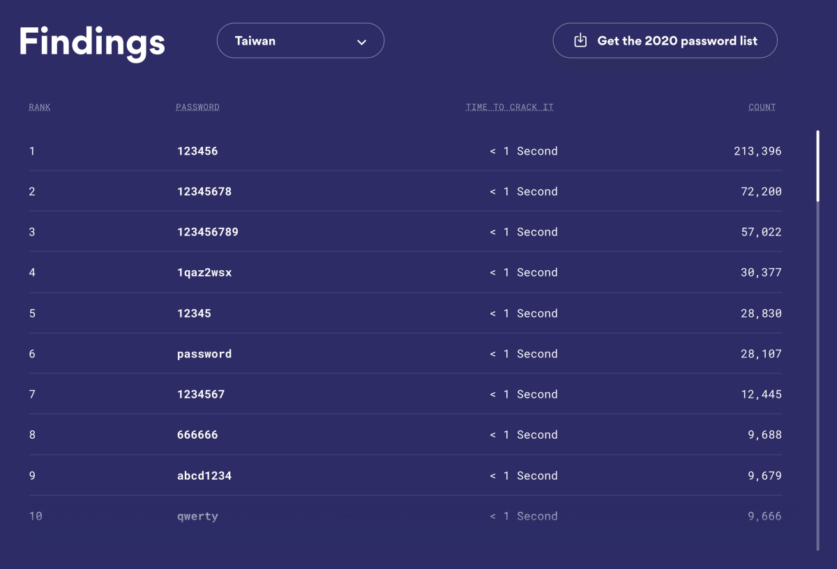 網站:https://nordpass.com/most-common-passwords-list/進入網站後直接往下拉,就可以查看全球最爛的密碼清單了,後面還有講多久時間會被破解,以及使用的人數量有多少(指的是從外洩清單統計到的數量,實際使用的人肯定是多不勝數)。