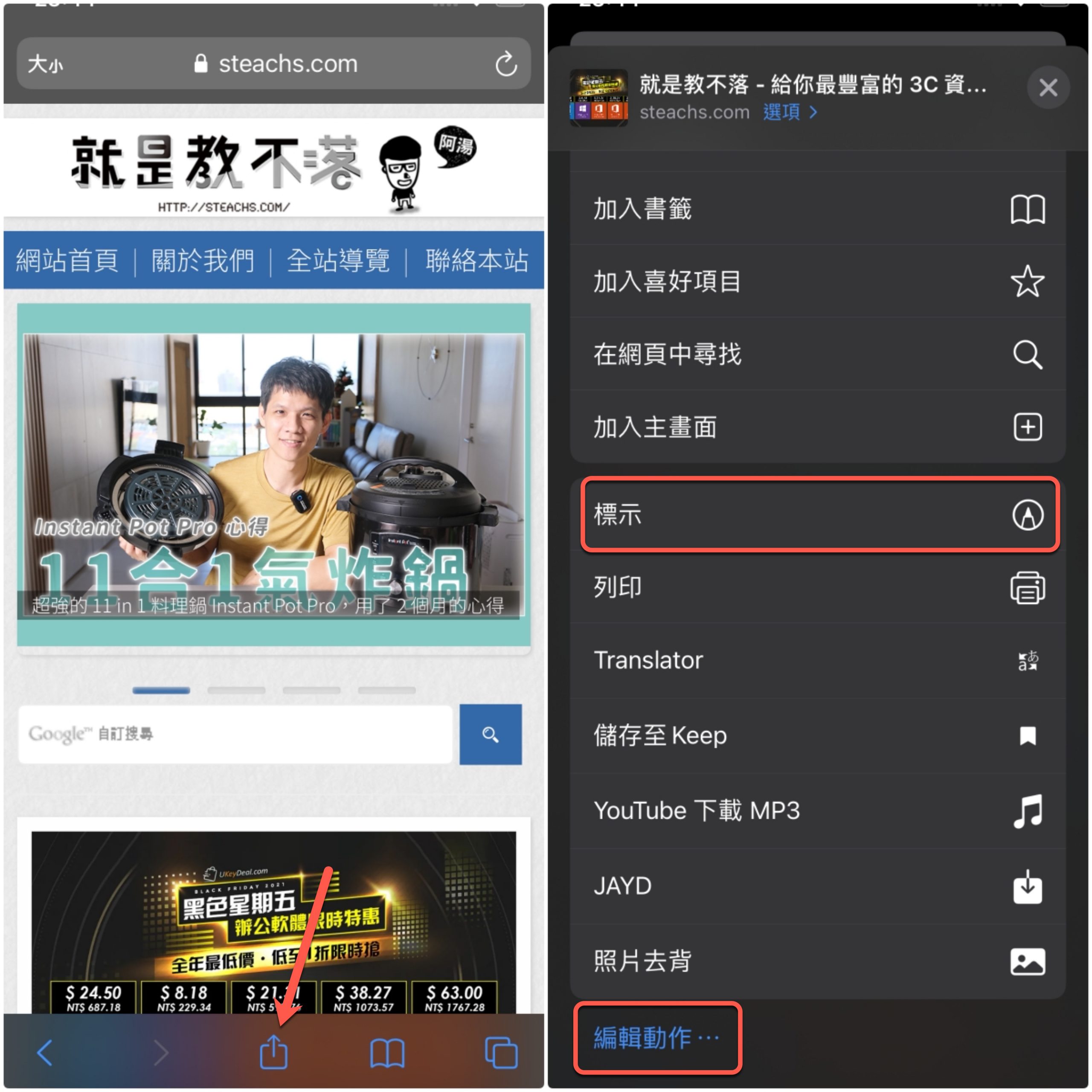 開啟你想要儲存的網頁頁面後,點擊下方的分享按鈕,然後選擇「標示」,如果你沒有看到標示這個功能的話,可以點擊最下方的編輯動作,把標示這功能增加上來。