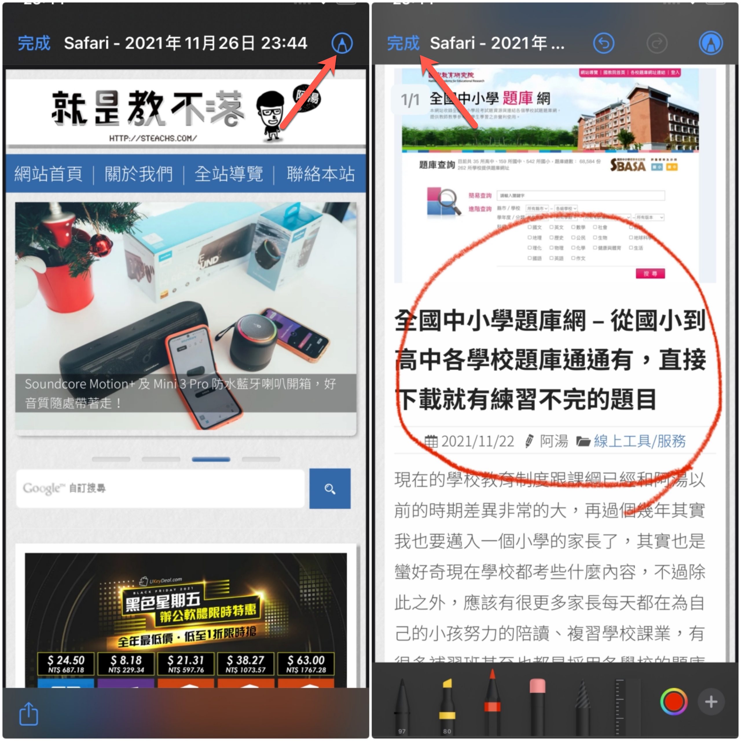 點擊標示後,其實這功能就是將網頁變成 PDF 讓你做標示使用,這時可以點擊右上角的筆圖示進行編輯標示內容,不論你有沒有要編輯,最後再點擊完成即可。