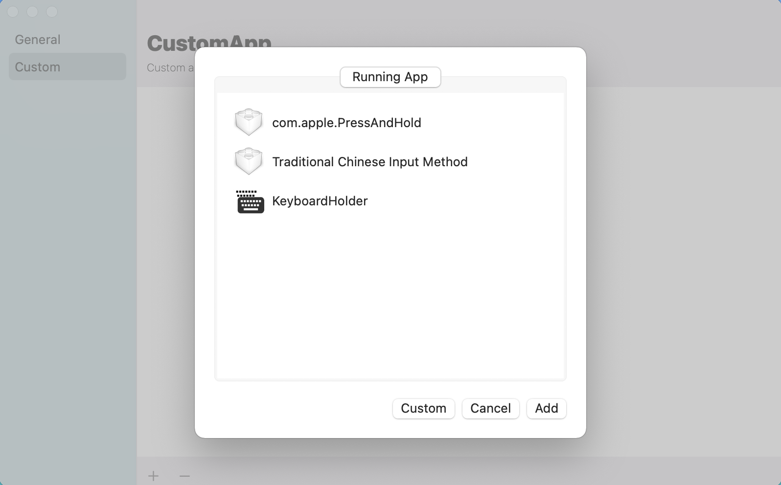 再來重點就是 Custom APP 這部份,點擊 + 後選擇想要設定的對應軟體。