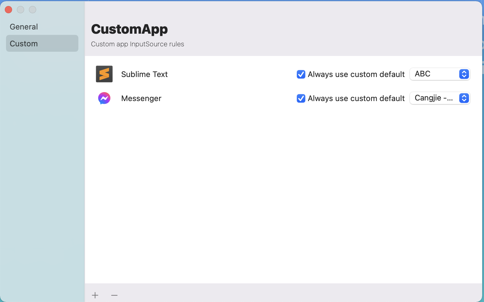 比如阿湯就把 Sublime Text 設定為英文輸入法,而 FB 的 Messenger 就設為倉頡中文輸入法,這樣每次換過去就不用切來切去,直接就可以打字了,相當的方便。