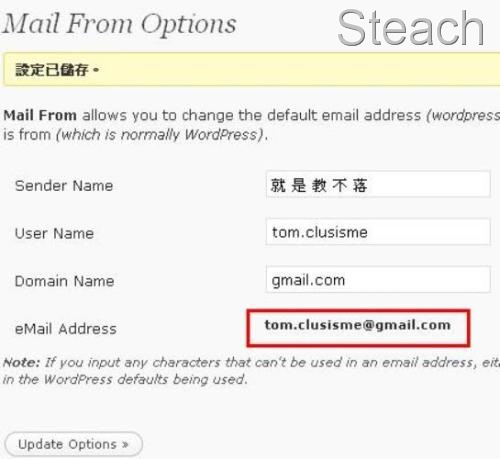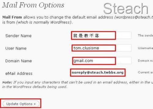 Sender Name:顯示的寄信者名稱 User Name:信箱的帳號(也就是email中@的前面) Domain Name:信箱的域名(也就是email中@的後面) eMail Address:目前顯示的系統信箱填寫完畢後按下Update Options就可以囉!