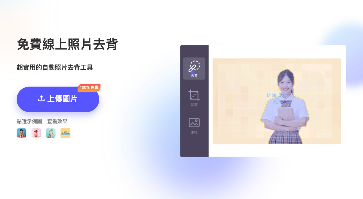 一上傳完立刻會顯示自動去背的成果,基本上只要人很明確,都會去背的很好,如果有沒去好的,也可以再用擦除跟保留來調整。
