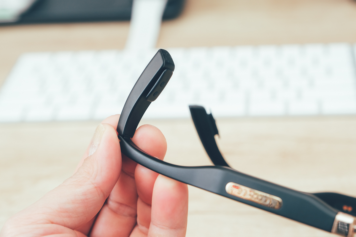 在鏡腿的地方就像這樣,戴上去後再壓到你覺得可以戴的穩固且可以貼上你的耳骨,以戴的舒適為主,而骨傳導的技術也是透過貼近你的耳骨來傳遞聲音,比起傳統的骨傳導藍牙耳機設計的更好,完全不挑耳型,保證都能貼上去,能有更佳的聲音傳導。