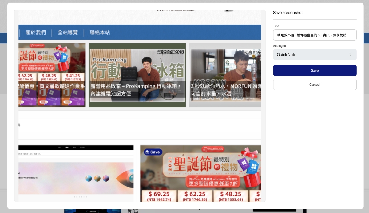 像是截圖,你截圖後會跳出 Notion 的儲存畫面,可以選擇儲存到 Notion 的哪一個分類裡,你就可以到 Notion 那去使用,相當的方便,對於整理網路資料會更加輕鬆,當然我也是比較推薦已經有在用 Notion 的人使用。