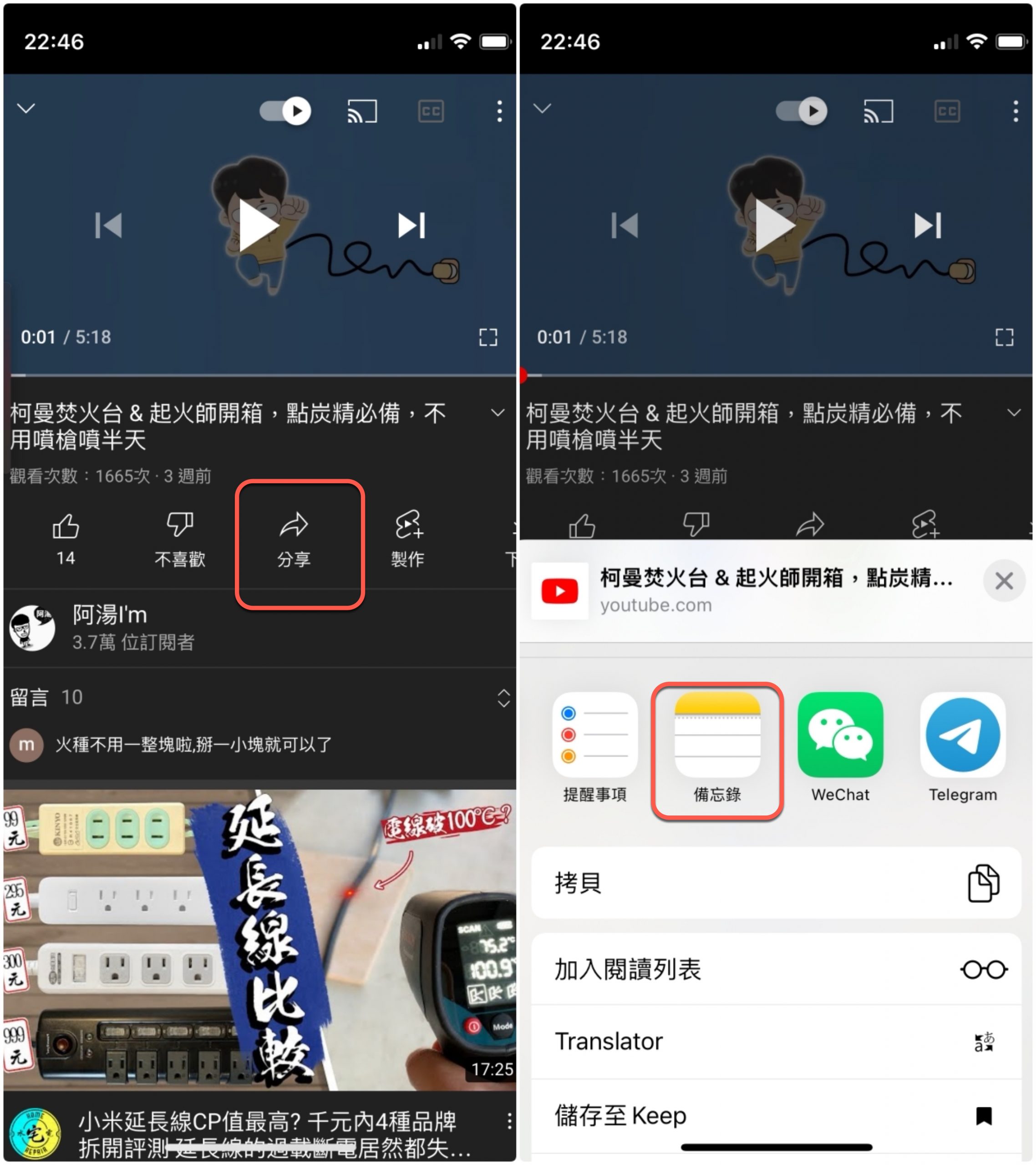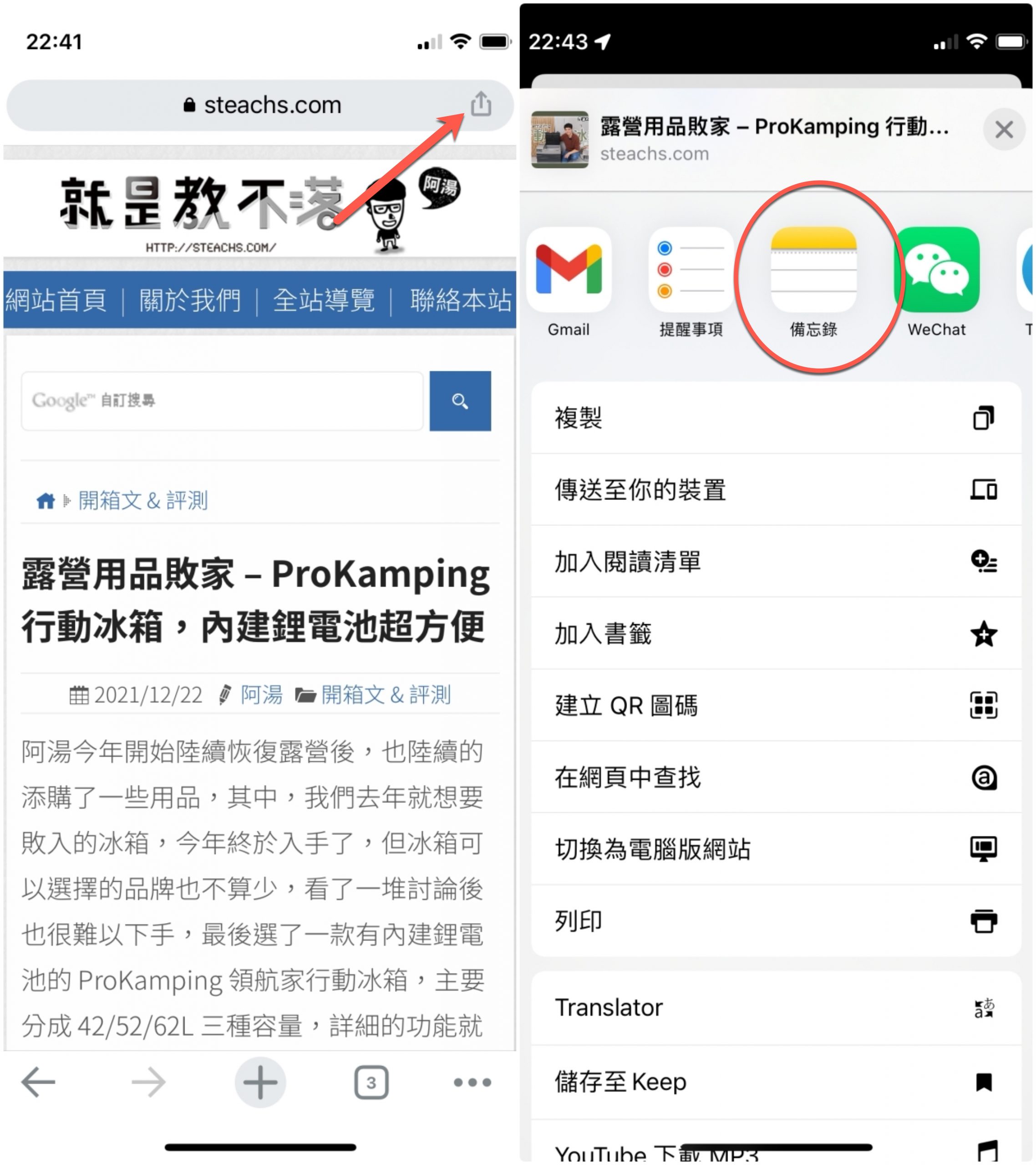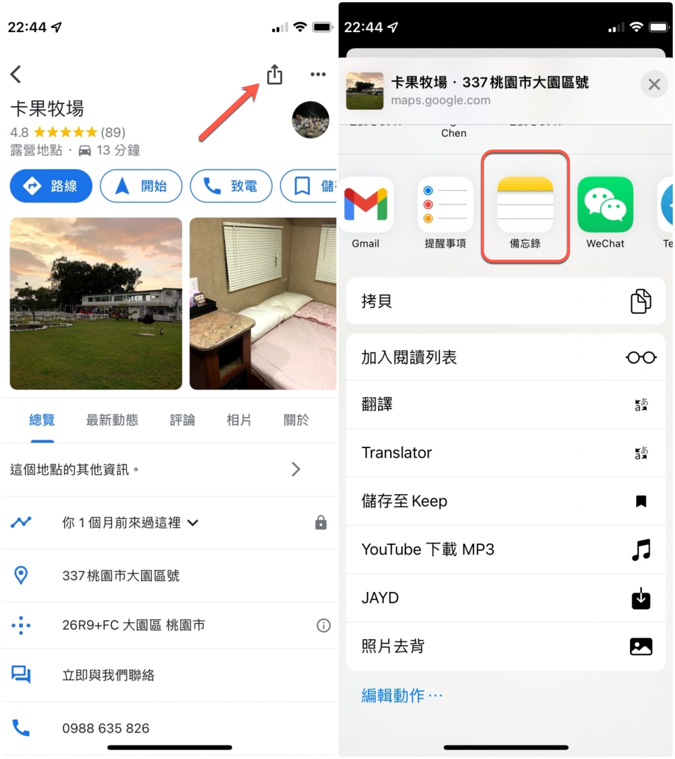 使用方式很簡單,不論你是網頁、IG、YouTube 還是地圖都一樣,以 Chrome 瀏覽器的 APP 為例,按分享按鈕後,選擇「備忘錄」。