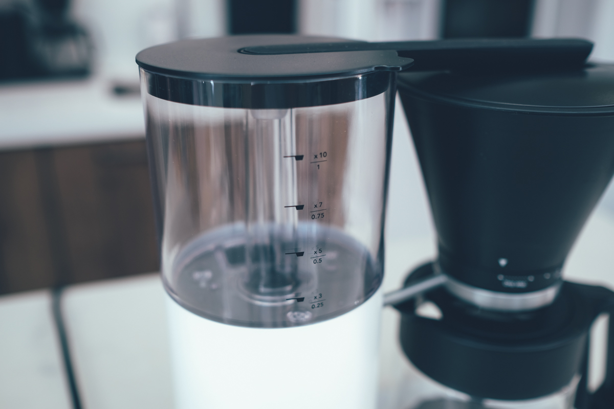首先我們來看一下加水區,上方是已經有標好各種刻度,比如三個高度的水溫是 7 匙 / 0.75,代表著如果你要泡 0.75 公升(750ml)的咖啡,就把水加到這個水位線,並且在濾杯加入七匙咖啡粉。