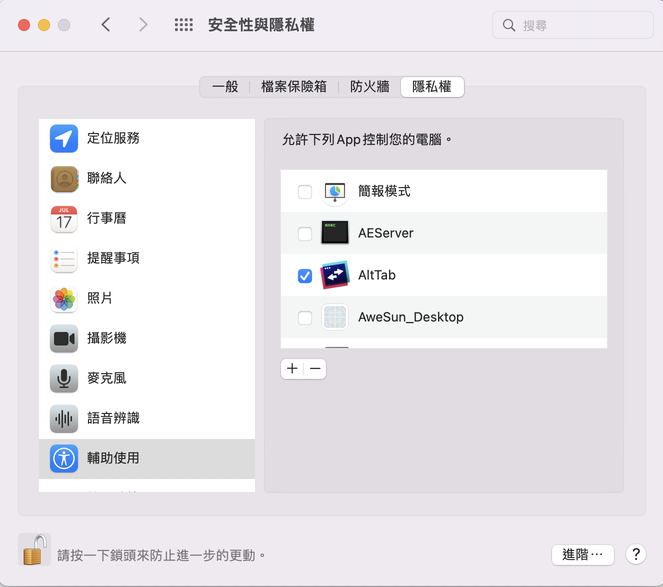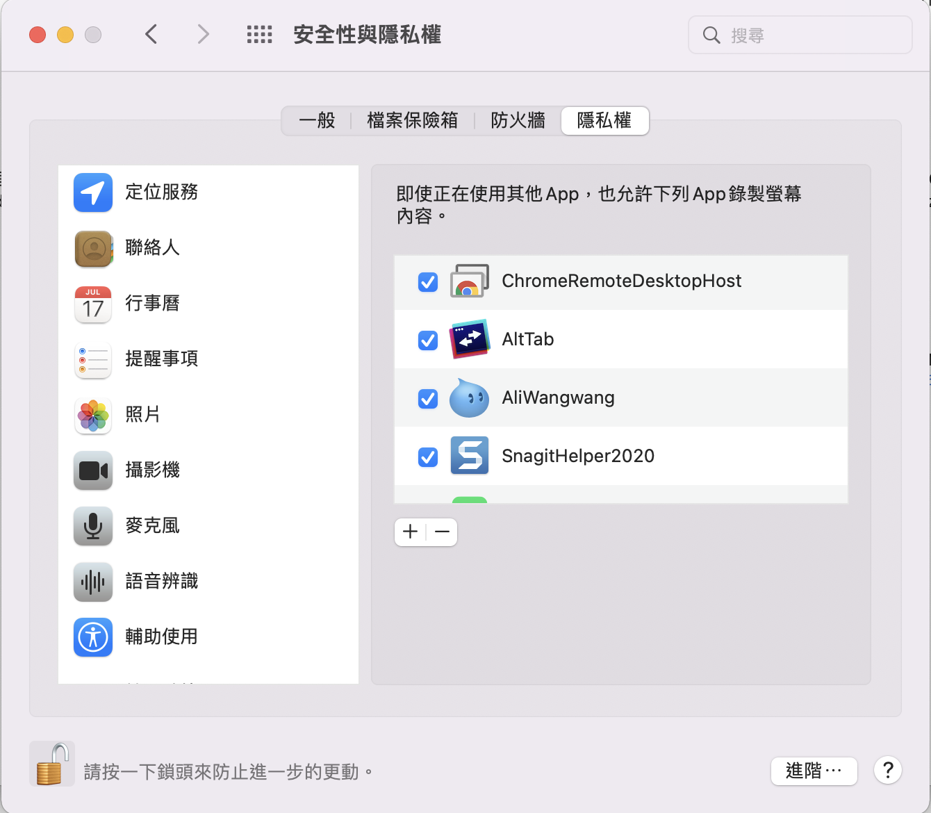 第一次執行需要開啟二個權限,可以在設定 > 安全性與隱私權 > 隱私權 > 錄製螢幕的權限,將 AltTab 勾選。