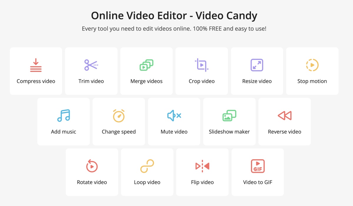 網址:https://videocandy.com/在首頁就可以看到各種影音功能,包括壓縮,剪片段、合併影片、加入音樂、改速度、製作投影片等,非常的多,選擇想要使用的功能後上傳。