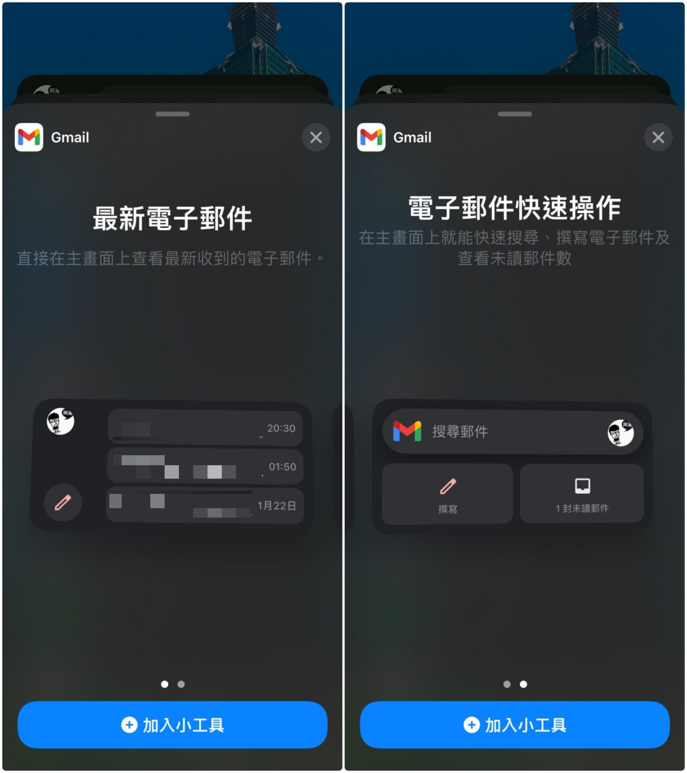 首頁 › 手機應用教學 › Gmail 終於在 iOS 新增桌面小工具,可以更直覺的查看及操作 Gmail 終於在 iOS 新增桌面小工具,可以更直覺的查看及操作 發佈日期:2022/1/24 作者:阿湯 分類:手機應用教學 iOS 開放桌面小工具的功能後,陸續愈來愈多 APP 跟進加入了桌面小工具的功能,不過阿湯一直在等的最主要有二個,一個是行事曆,另一個就是 Gmail,行事曆之前就已經可以加入,最近終於 Gmail 也新增了桌面小工具功能,可以直接在桌面新增一個視窗,快速查看前三封郵件,以及直接快速點擊搜尋、撰寫郵件,比點進 Gmail 更快更方便。 如何在 iOS 新增 Gmail 桌面小工具 記得要先把 Gmail 更新到最新版本,然後在桌面長按後,左上角點擊 + ,找到 Gmail 點擊。 一共有二種桌面小工具可以新增,一個是查看最新的電子郵件,另一個是可以快速搜尋、撰寫及查看目前未讀郵件數量。 新增後的樣式就長這樣,相當的方便,快去試看看吧。