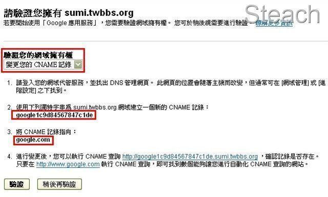 驗證方法請選擇〝變更你的CNAME記錄〞下方會出現一串文字google1c9d……是用來讓你綁在網域上以確認域名是否你所有可先按下驗證,也可先不按,下面站長提供了Co.cc及twbbs.org二種網域分別綁上驗證字串的方法!