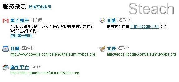 服務介紹:用自己的網域來綁定Google網路應用服務,像是Gmail、Google文件、Google日曆、Google Talk、Google Sites協作平台等。