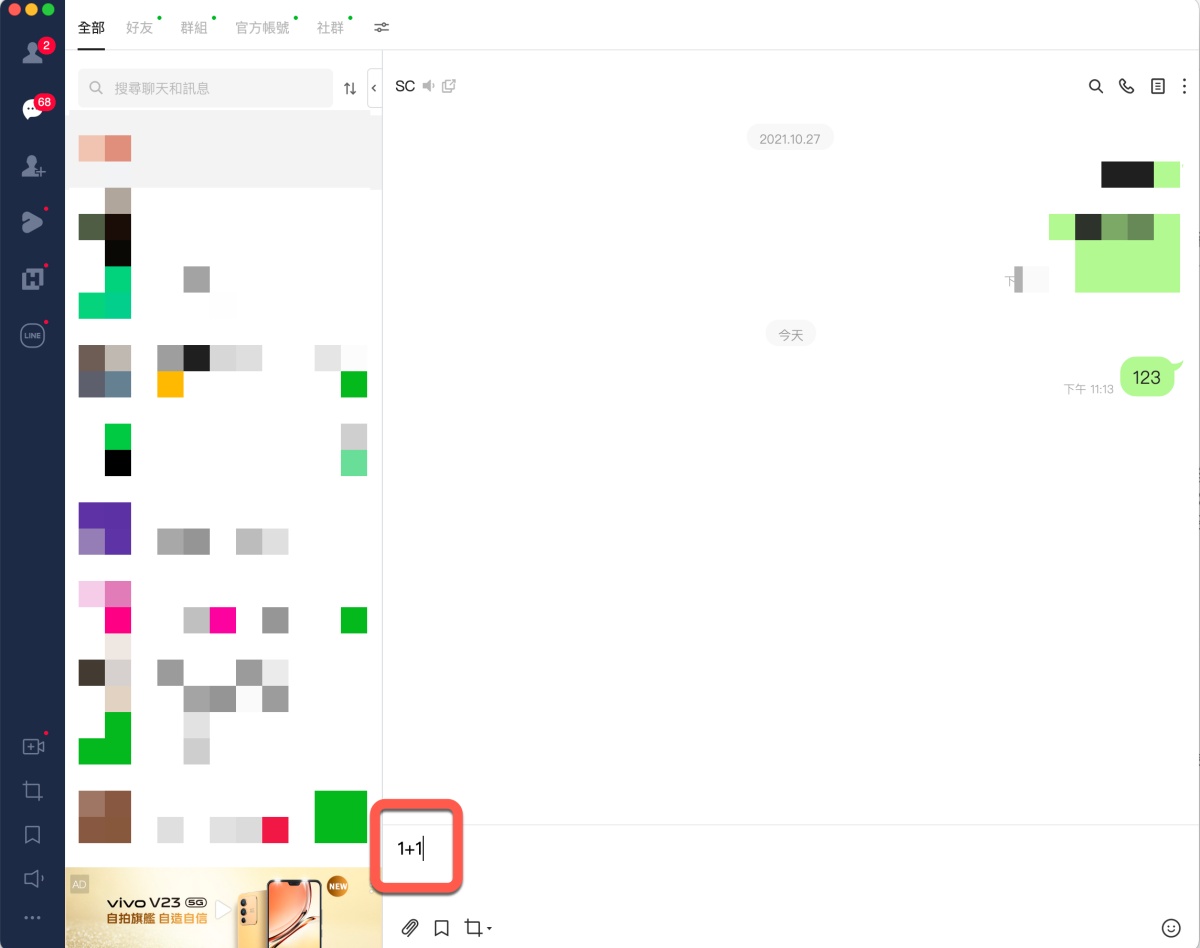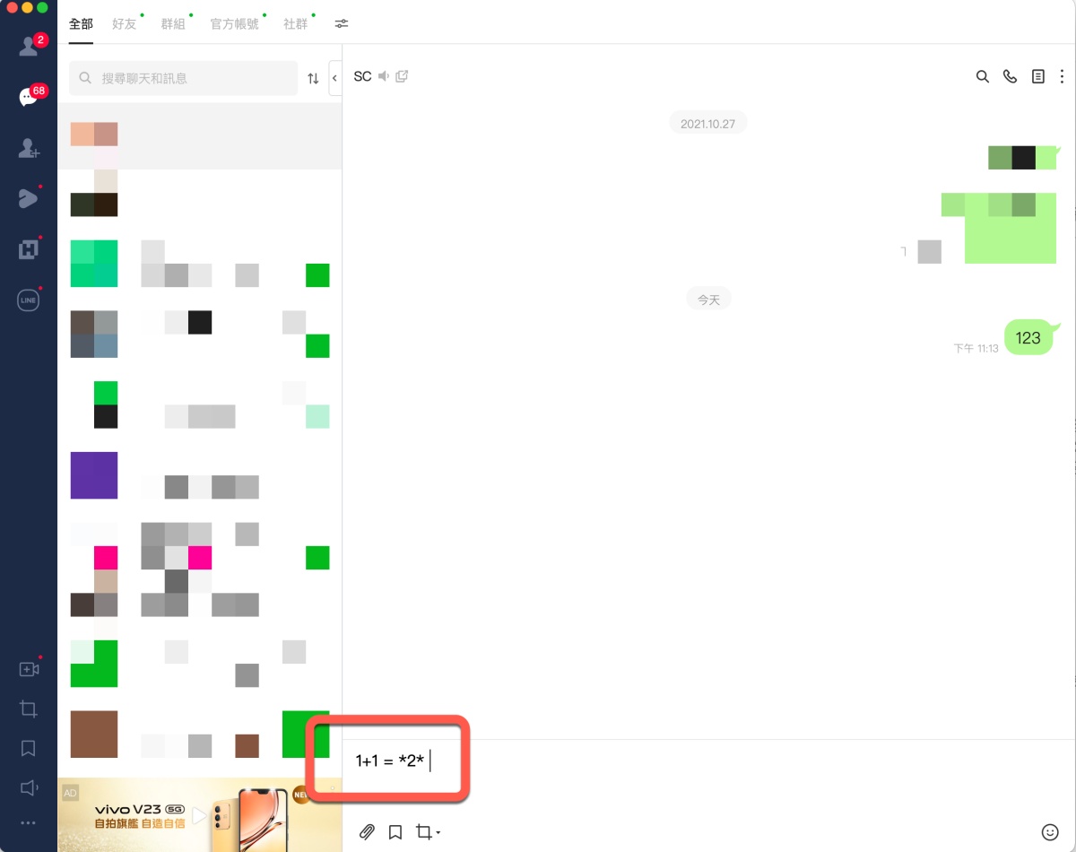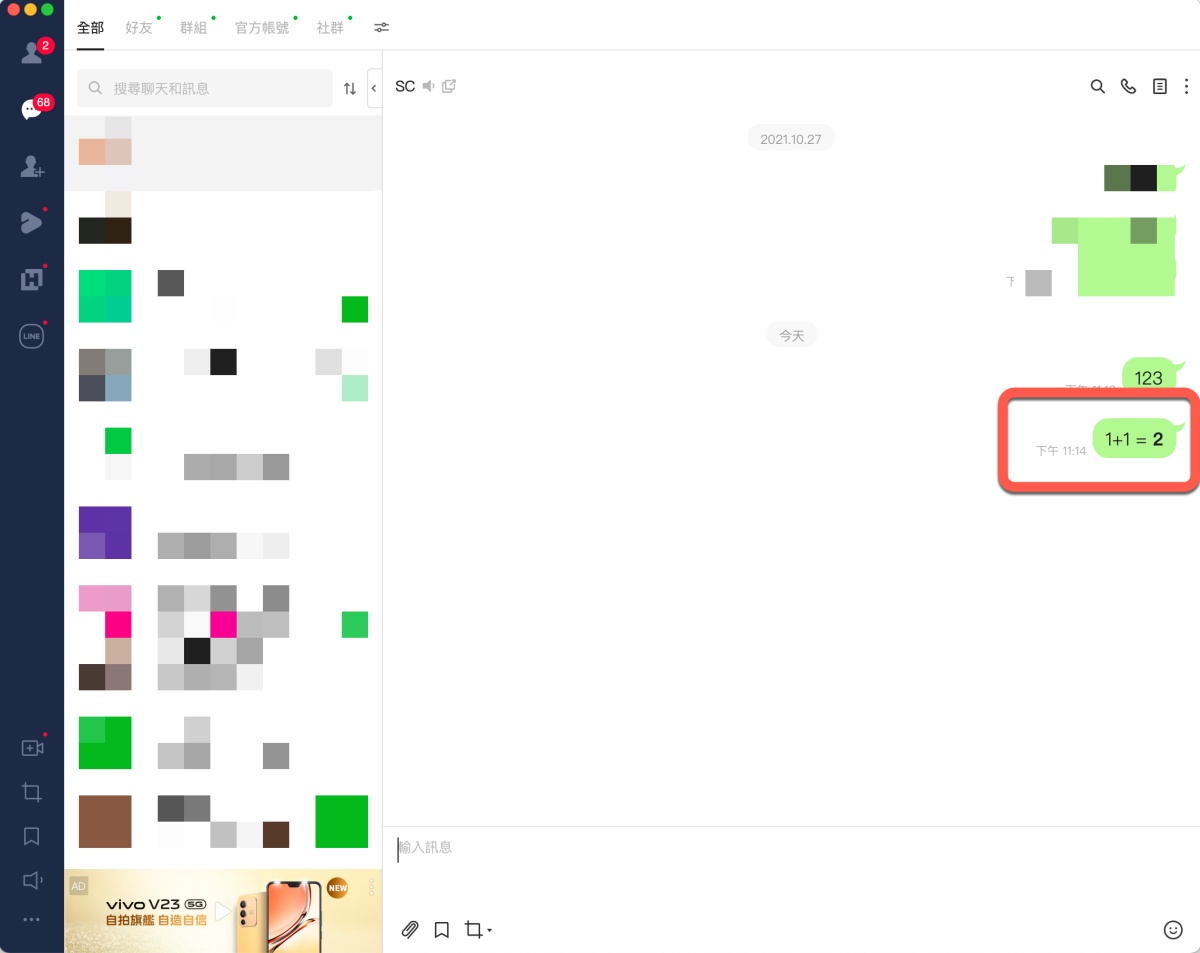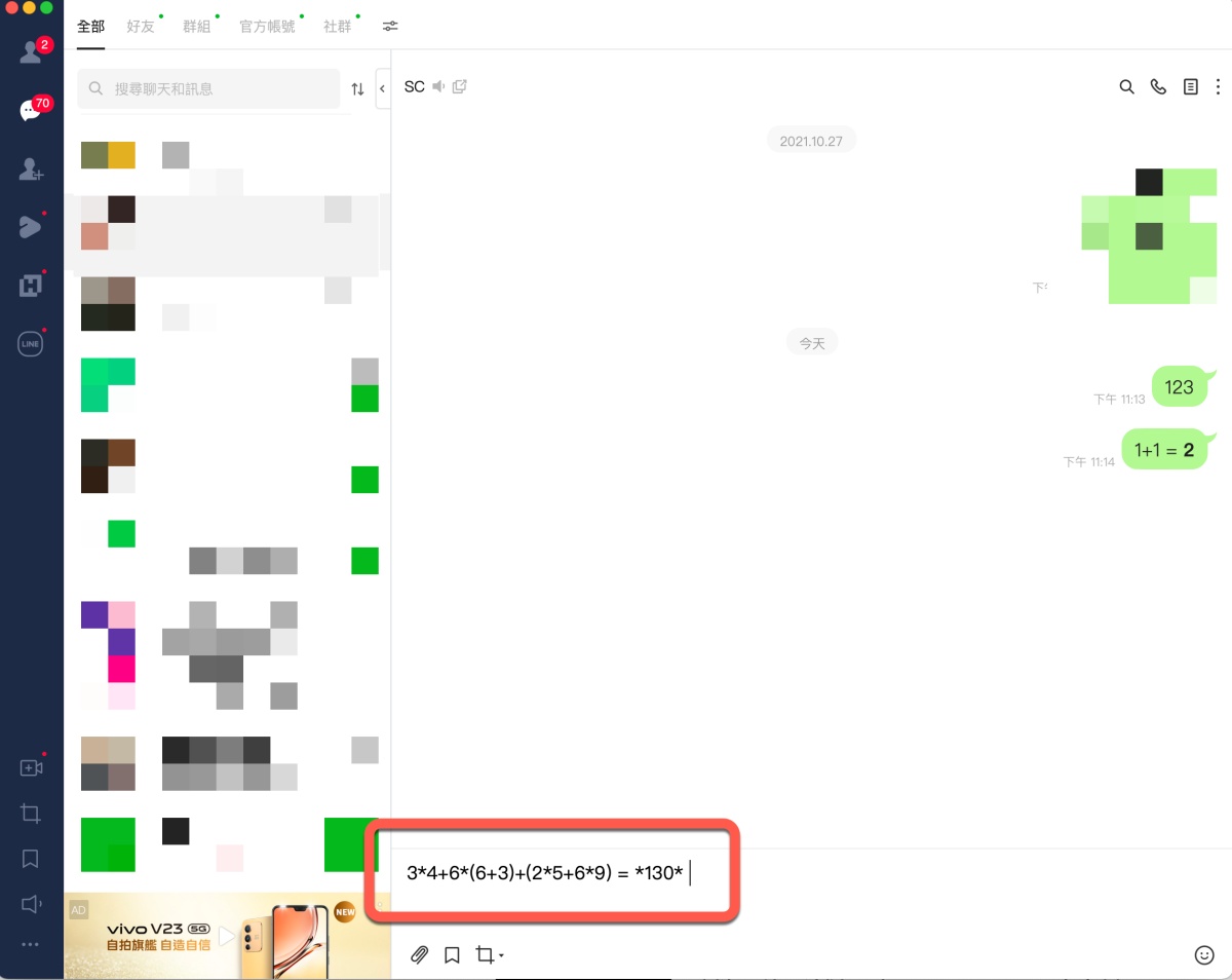 首頁 › 網路大小事 › LINE 隱藏小技巧,直接輸入算式加上等號就能獲得答案! LINE 隱藏小技巧,直接輸入算式加上等號就能獲得答案! 發佈日期:2022/2/8 作者:阿湯 分類:網路大小事 在 LINE 裡其實隱藏了很多小技巧,其中今天要跟大家分享是相當實用的「計算」功能,LINE 現在幾乎是大家不可或缺的一個聊天工具,特別是和朋友聊到飯錢或玩的錢,或是團購的錢怎麼分時,都會另外去按計算機,但事實上在 LINE 的電腦版上呢,只要輸入算式,再加上等號,就會得到算式答案,完全不用再跳出去按計算機,相當的方便,往下來看。 LINE 隱藏小技巧,輸入算式加上等號 首先,我們先試看看在對話框裡打上 1+1 ,在這樣的情況下是不會有任何其它顯示,我們往下來看。 當你加上等號後,後面就會用二個 * 包住答案。 當你送出時,* 不會顯示,直接就有答案。 即便是像這樣複雜的算式也沒有問題,這真的是超實用方便的功能,大家快試試吧。