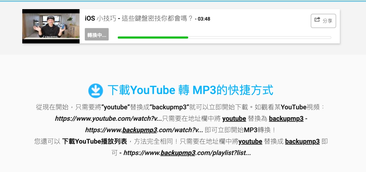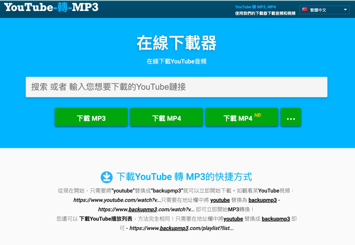 網站:https://www.backupmp3.com/zh貼上你想要下載的 YouTube 網址,後選擇下載為 MP3、MP4 或是 MP4 高畫質版。