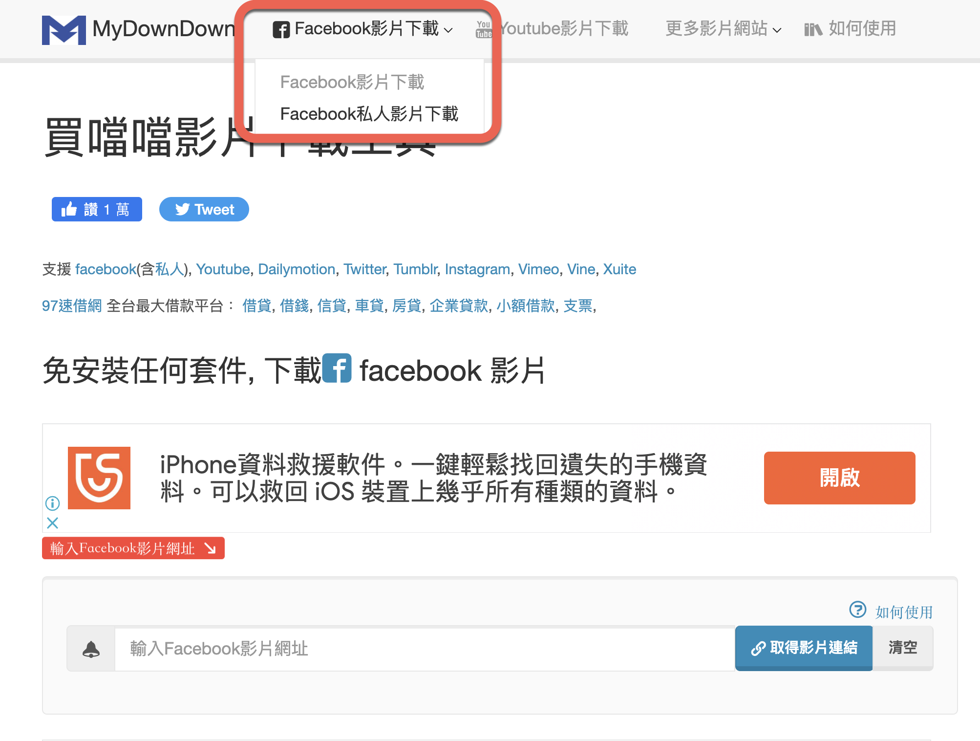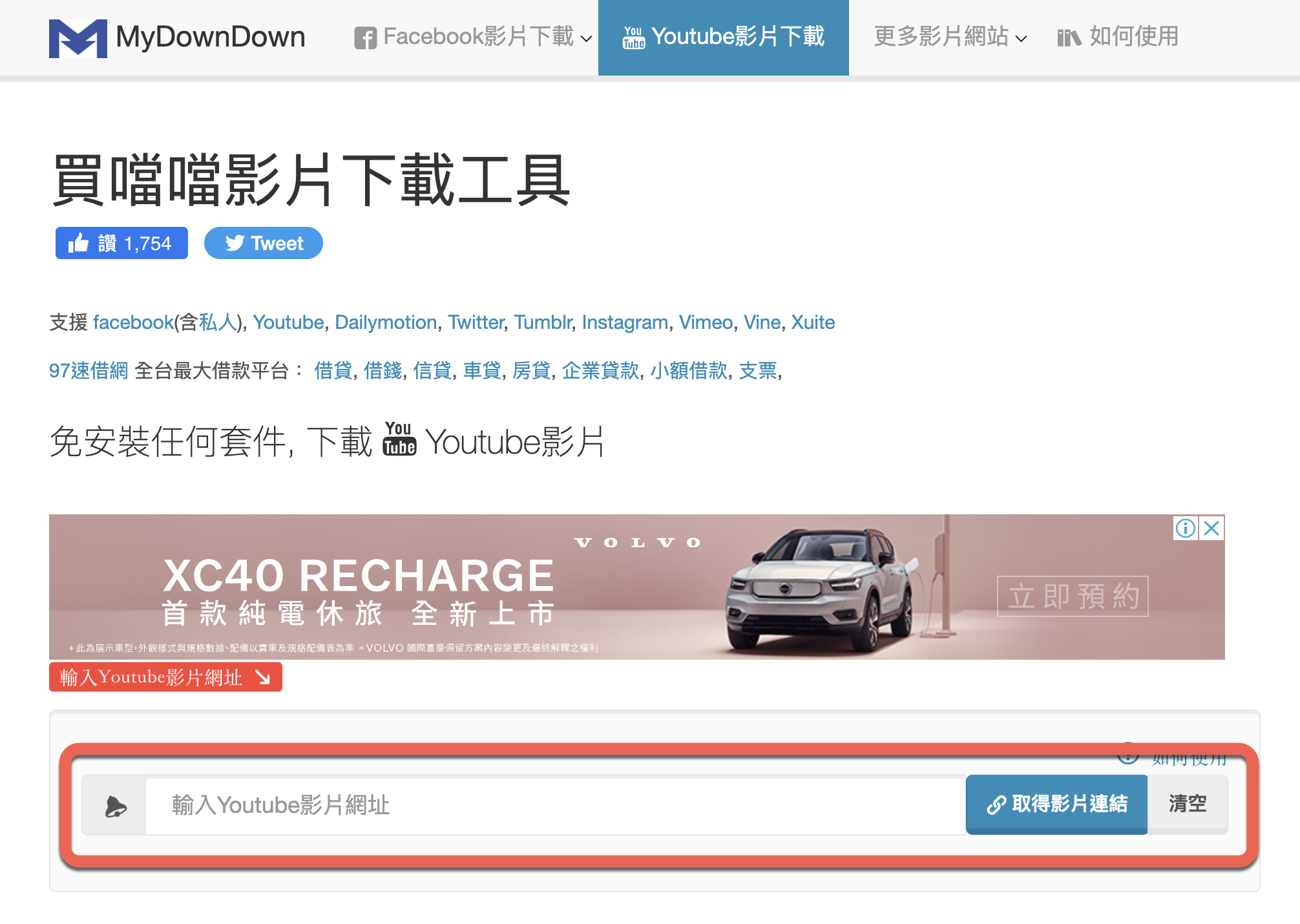 網站:https://mydowndown.com/進入網站後,首頁預設就是 YouTube 的影片下載,直接貼上要下載的 YouTube 影片就可以產生下載連結。