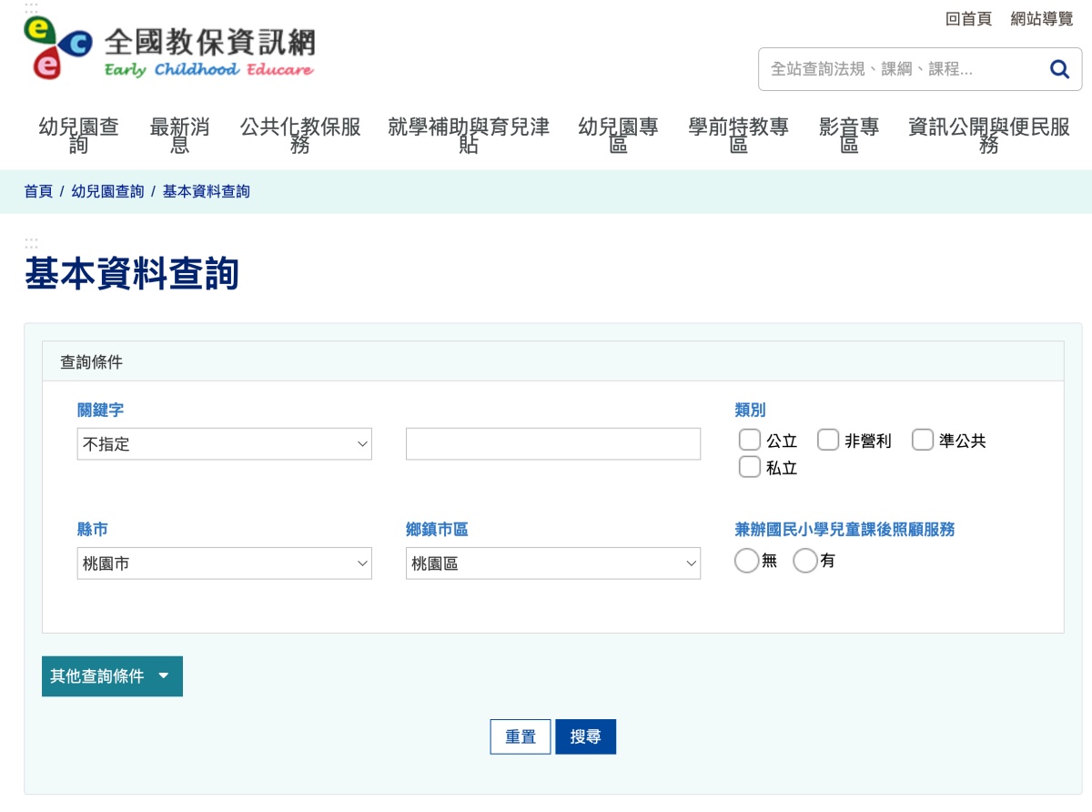 網站:https://ap.ece.moe.edu.tw/webecems/pubSearch.aspx進入網站後直接選擇要搜尋的條件後按下搜尋。