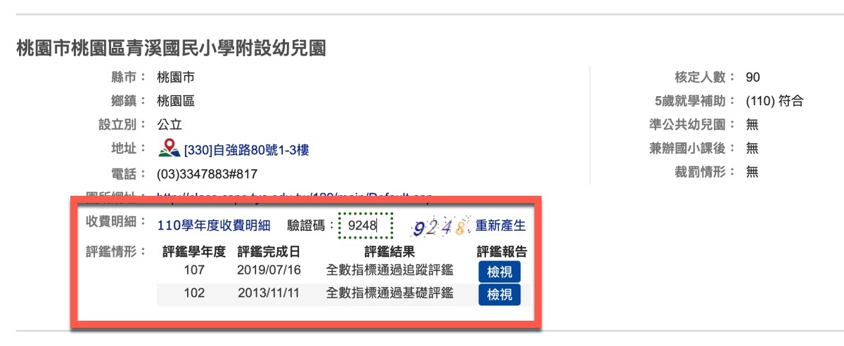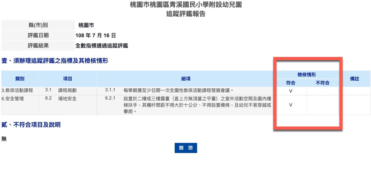 而評鑑報告主要是針對教育部有做的評鑑,在這裡就可以查看評鑑的結果,如果有不符合的,也可以查看一下這間幼兒園不符合的原因是什麼,由此就可以先篩選一波,減少找幼兒園的時間囉。