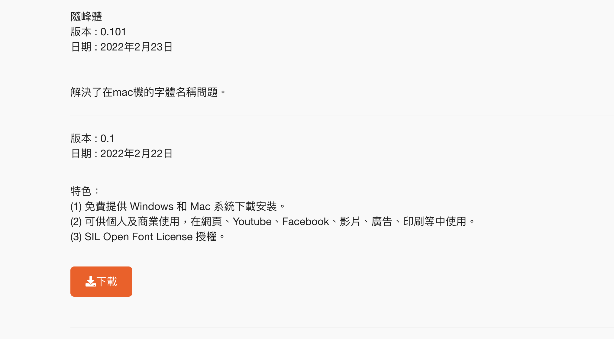 首頁 › 線上工具/服務 › 免費可商用繁體中文字型「隨峰體」,文青書寫風格 免費可商用繁體中文字型「隨峰體」,文青書寫風格 發佈日期:2022/3/31 作者:阿湯 分類:線上工具/服務 免費中文字型非常的多,自從有 AI 技術後,也愈來愈多個人的字型開發者,但是像今天要分享的這款隨峰體,就是由香港人阿坤歷經二年,一個字一個字所撰寫開發起來的,所以完全是自創的字體,非常的強大,目前雖然是 Beta 版,日後預計正式版推出後,同樣是免費可自由商用,完全佛心來著,阿坤就是個真正熱愛寫字的人,請大家用力支持這個字體吧! 免費可商用繁體中文字型「隨峰體」 網站:https://cjkfonts.io/blog/ThePeakFont 進入頁面後往下拉就可以找到下載點,目前版本是 0.101,已經算是蠻完善,是由香港人所開發,所以大致上繁體中文字都是支援的。 給大家看一下這字體的 Demo,真的蠻好看的,很有味道的書寫體,重點是可以商用,有需要就去下載來試試吧。