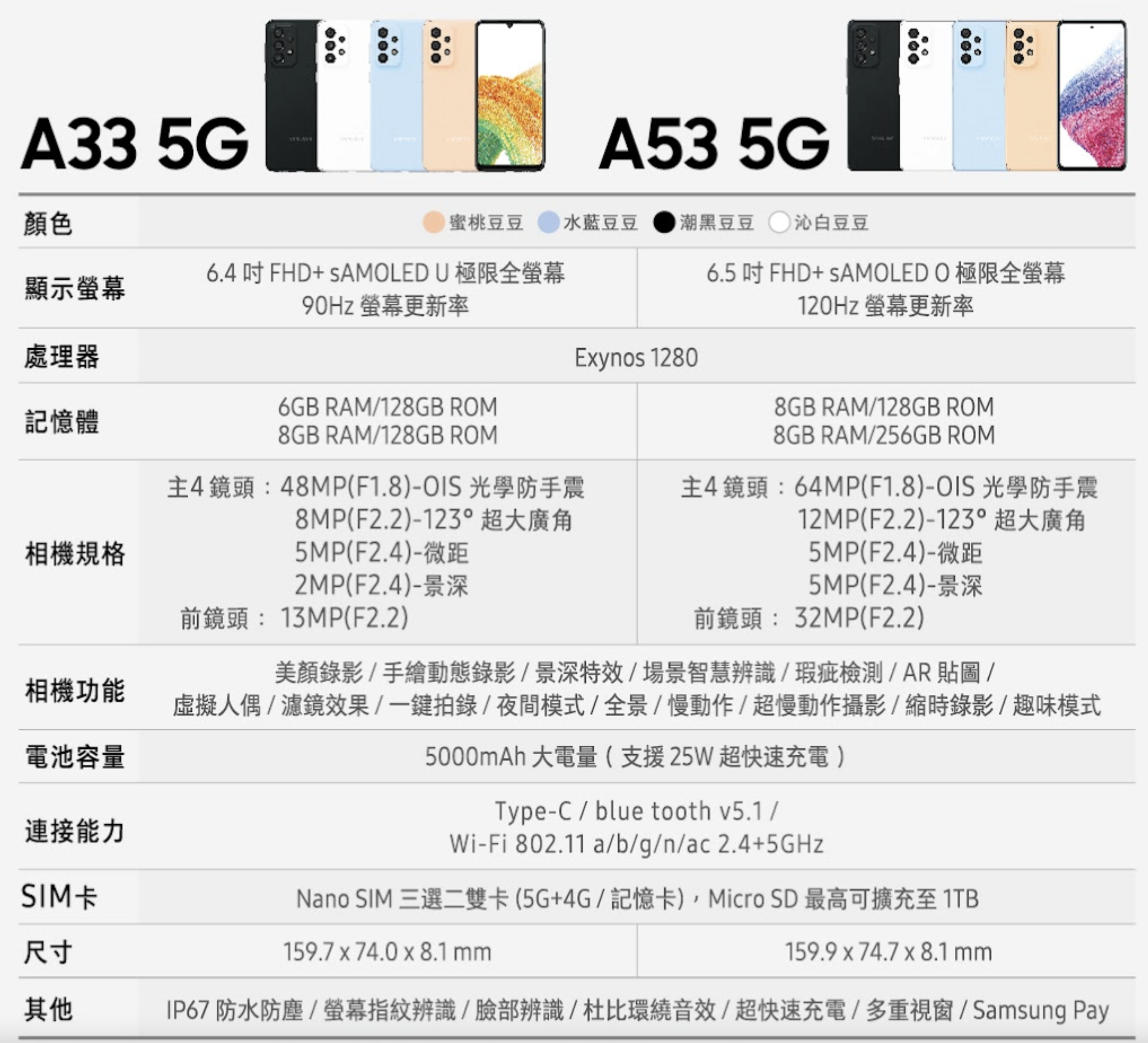 Galaxy A33 5G 及 A53 5G 皆推出四款顏色,分別是蜜桃豆豆、水藍豆豆、潮黑豆豆、沁白豆豆,阿湯都非常的喜歡,不過認真要挑,我個人最忠愛白色系的。