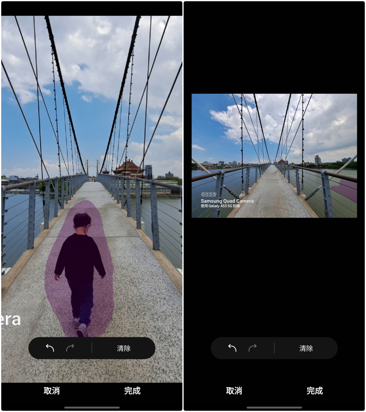 拍照完的成像如果有路人甲乙丙丁的話,也不用擔心,在 Galaxy A53 5G 的相片編輯功能中,這次加入了「物件橡皮擦」的功能,點擊後直接框選要移除的物件(可放大照片後再圈會比較精細哦)。