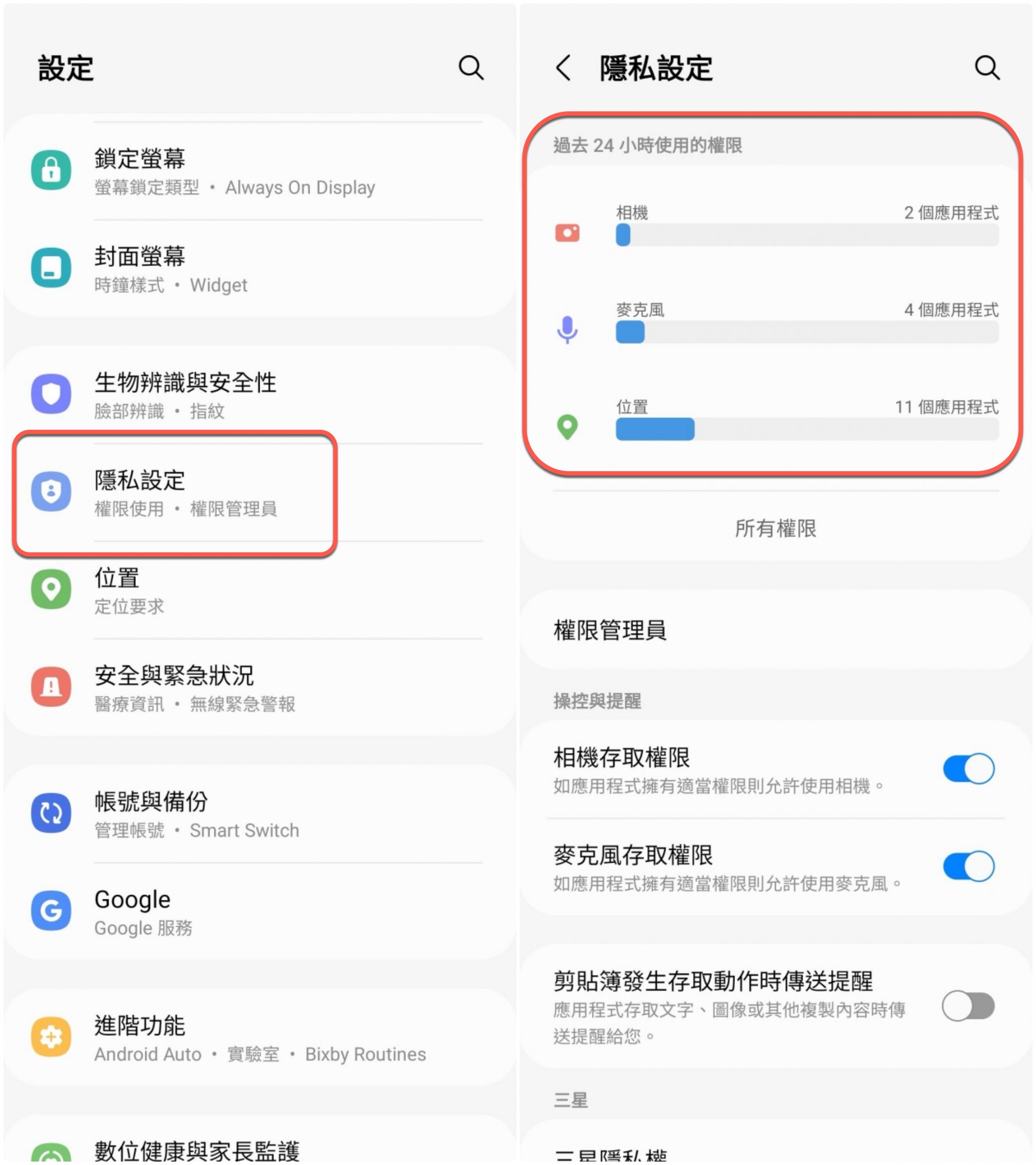 進入設定裡的隱私設定,在最上面就可以看到「過去 24 小時使用的權限」。