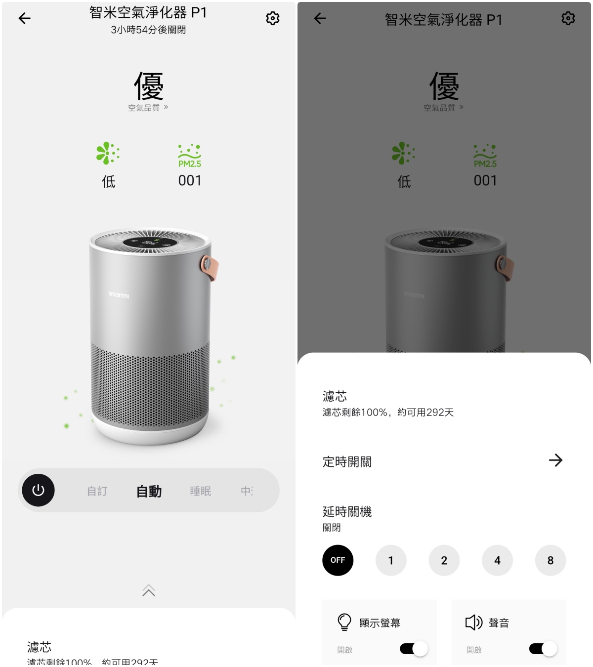 APP 的介面也相當的簡易好操作,主要顯示目前空氣品質以及一些基本設定,一切都非常的簡化,包括像是運轉模式、濾芯壽命、定時設定、面板燈號顯示等。