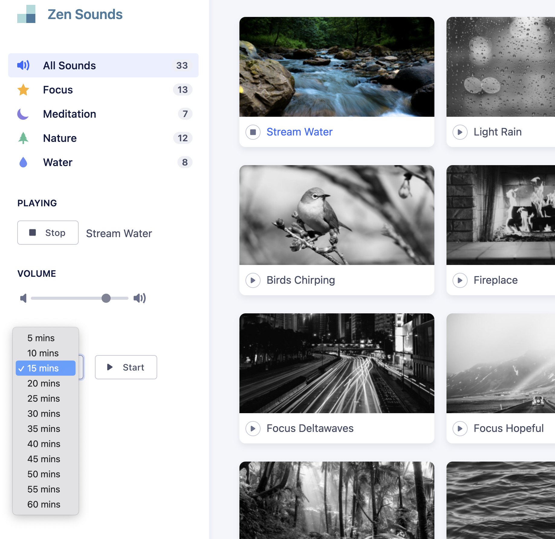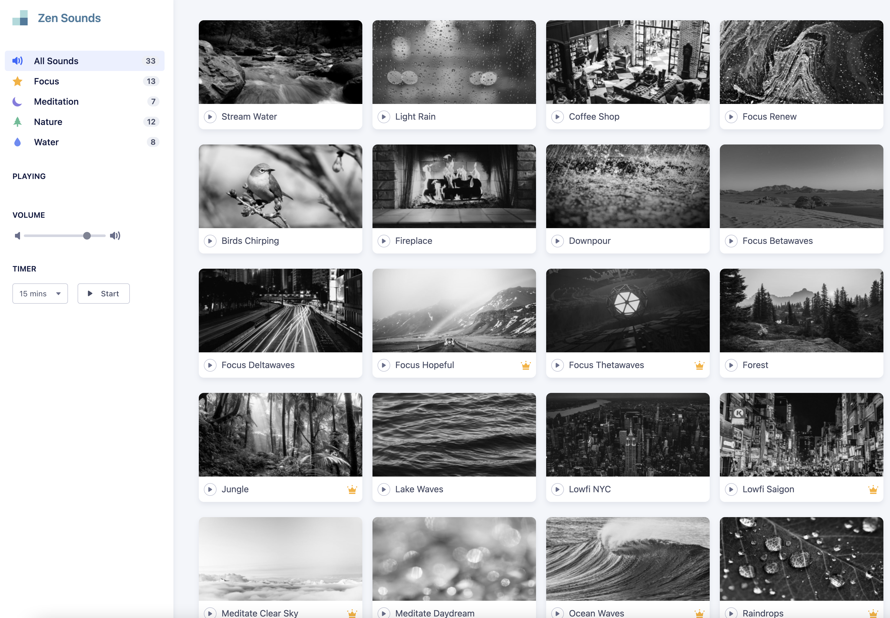 網站:https://app.zenflowchart.com/zen-sounds進入網站後,左側有分類別,或是直接點 All Sounds 後,右側直接選擇想要聽的內容,就可以進行播放。
