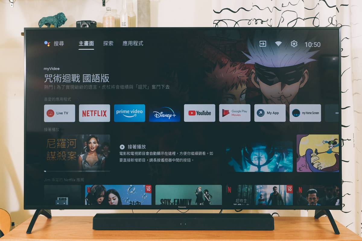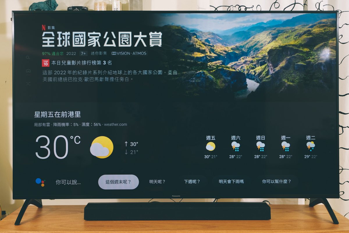 支援 Google 語音助理,光是有這個就好處多多,除了最基本的一些常用指令,像是問天氣、問有的沒的事,也能搜尋影音內容,如果你家中本來就有用 Google 結合智慧家電的話,也能透過這電視的語音助理直接控制,透過電視控制電燈、冷氣等(像阿湯家裡的冷氣也是 Panasonic 結合到 Google)。
