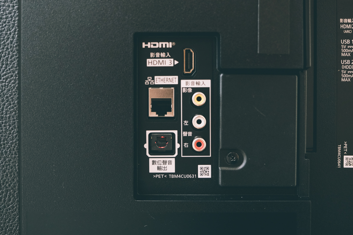 而右側的正後方有 HDMI x1、乙太網路孔、AV 端子、數位聲音輸出。