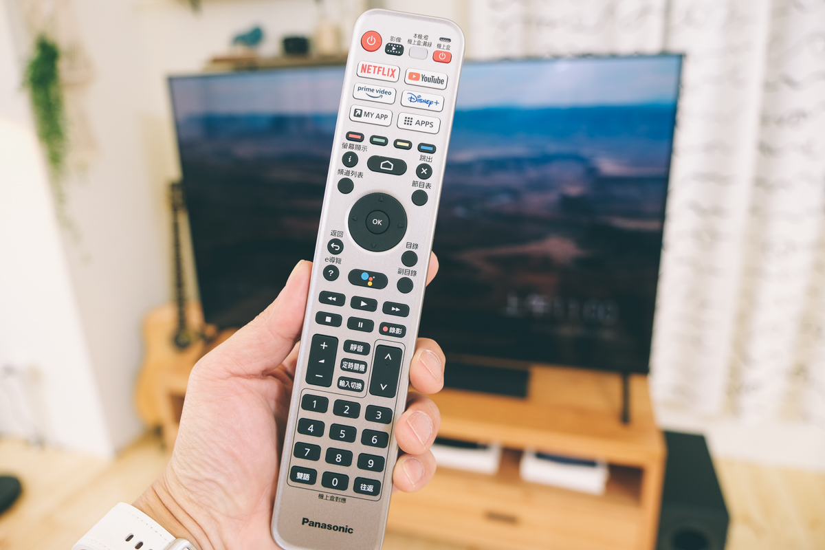 這電視遙控器上應有儘有,除了預設的一些基本操作外,最上方還有各種快捷操作鍵,像是機上盒的切換、APP 快速操作包括 Netflix、YouTube、prime video、Disnep+,以及進入 My APP 跟 APPS 列表,透過遙控器也能一鍵呼叫 Google 語音助理,不只是動手能操作,動動嘴也沒問題。