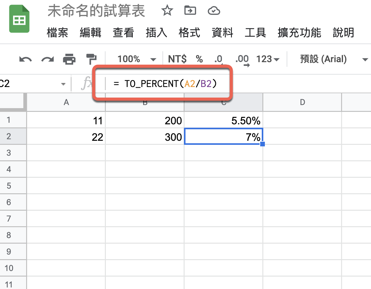 先講一下 TO_PERCENT 這個函數,也是 Excel 沒有的,一般我們要計算百分比,會直接相除後用儲存格格式,但在 Google 試算表中還有這個函數可以用。