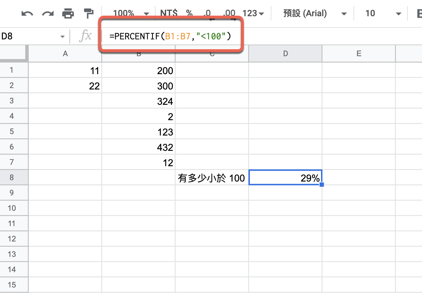 =PERCENTIF(B1:B7,"<100")B1:B7 就是你要搜尋資料的範圍,後面的 <100 就是條件,在這資料範圍中符合 <100 的佔多少百分比,這我想在很多統計資料中都用的到,用這一個函數就可以輕鬆搞定,大家可以去試看看。