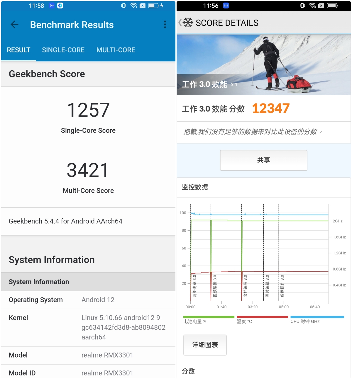 下面就來分享一些跑分的數據,透過 Benchmark 測試獲得 1257(單核)、3421(多核)。 PCMark 工作 3.0 效能為 12,347。