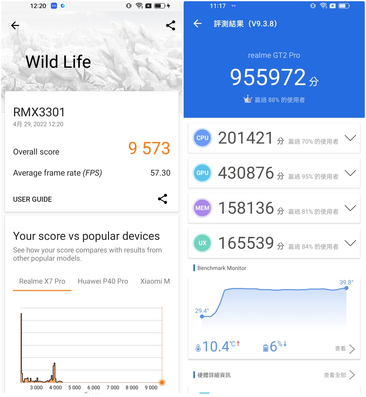 3DMark 的 Wild Life 獲得 9,572,而安兔兔則是獲得近百萬的 955,972,認真來說,如果認真用力的跑一下,SnapDrgon 8 Gen 1 這顆處理器要跑出破百萬的分數是輕輕鬆鬆的,效能真的很強大,我已經無法相信以前跑個十萬就是旗艦機型的時代,完全不可同日而語。