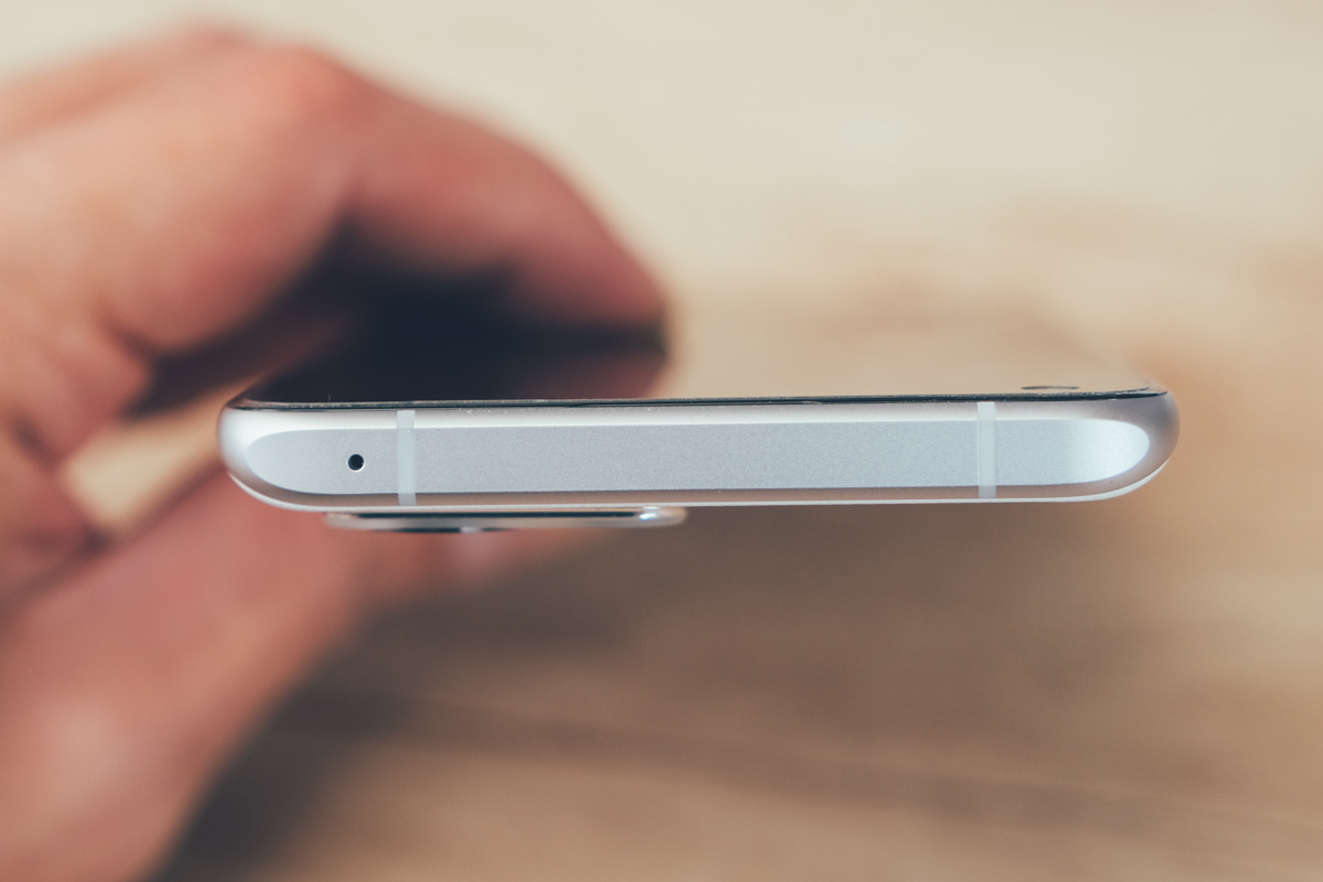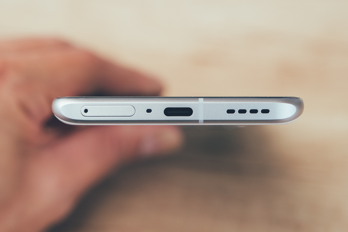 底部分別為 SIM 卡槽(支援 5G+5G 雙卡雙待)、降噪麥克風、USB-C 連接埠(支援 65W 超級閃充),以及揚聲器。