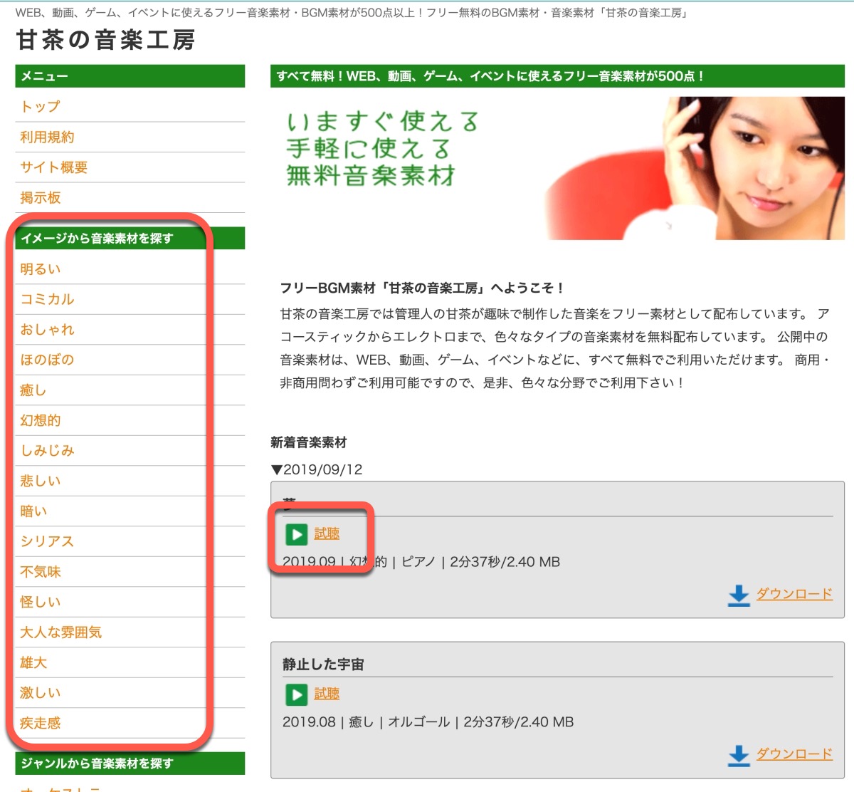 網站:https://amachamusic.chagasi.com/index.html進入網站後,左側就是類別,點擊後可以右側看列表,然後點擊試聽或是下載。