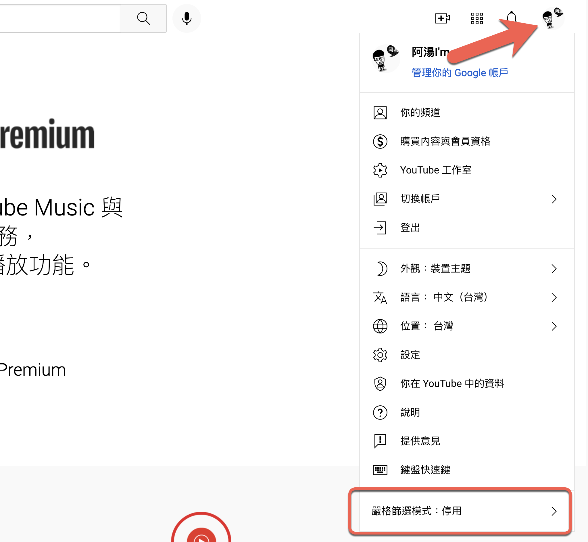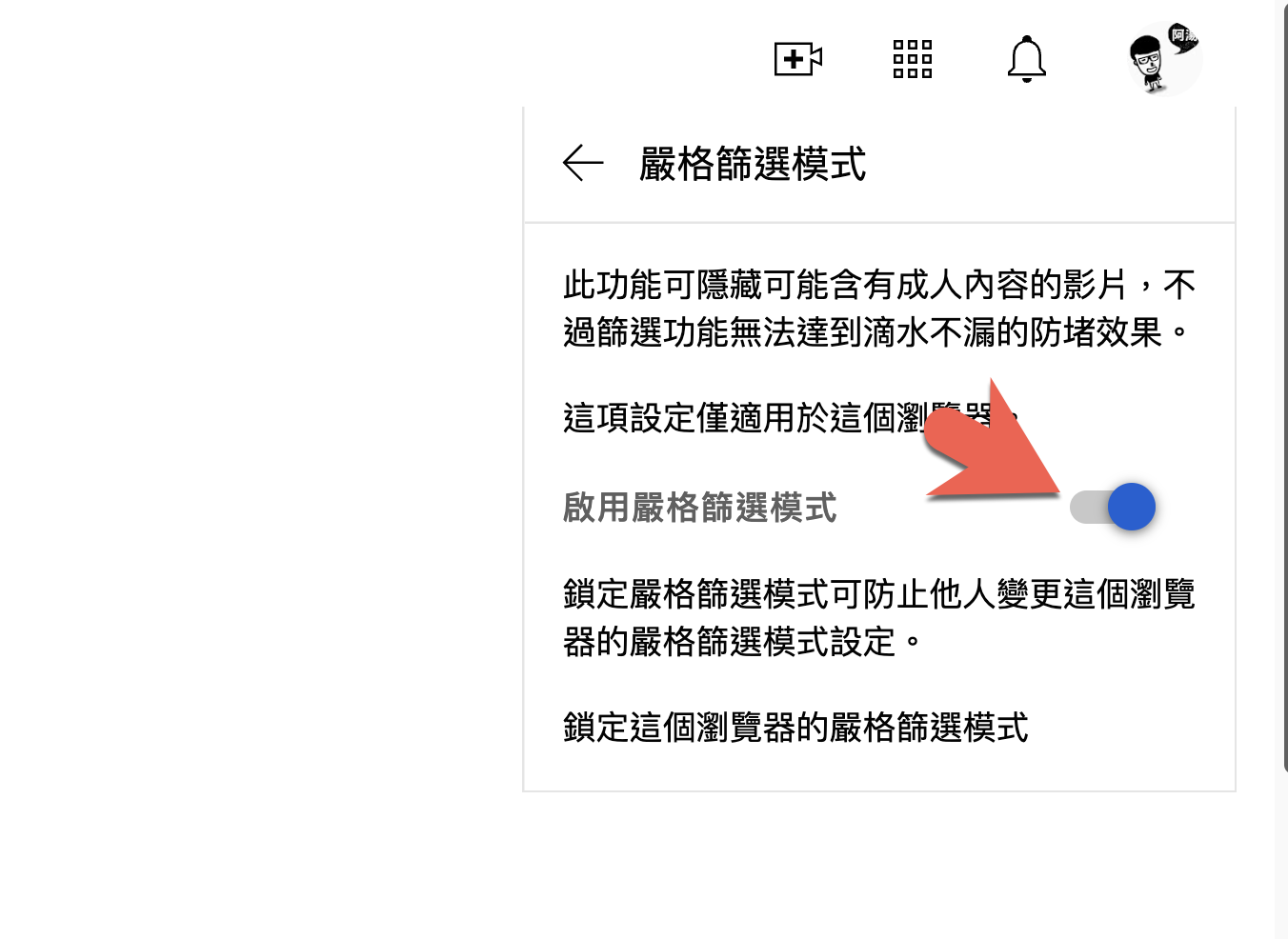 首頁 › 電腦小教室 › 開啟 YouTube「嚴格篩選模式」,避免兒童看到成人內容 開啟 YouTube「嚴格篩選模式」,避免兒童看到成人內容 發佈日期:2022/5/3 作者:阿湯 分類:電腦小教室 YouTube 的內容現在可以說是包羅萬象,而觀看的年齡層也逐漸降低,畢竟現在有些爸媽包括我,有時都會開一些 YouTube 上的兒童內容來看 ,雖然 YouTube 大多的相關內容會是跟你平常看的有關係,但偶而還是出現不 OK 的內容,小朋友就算只看到幾秒也不是太好,如果你身為爸媽,小朋友也有在看 YouTube 習慣的話,請先將嚴格篩選模式打開,就可以避免出現成人內容囉。 如何開啟 YouTube「嚴格篩選模式」?? 這個選項開啟都是針對設備,不是跟隨帳號,所以阿湯這邊分成網頁版跟 APP 版教學。 首先是網頁版,先在右上角點擊自己的頭像,然後最下面就可以找到嚴格篩選模式。 將他打開後,就會幫你篩選掉絕大多數的成內容囉。 再來是 APP 版本,如果你用的是手機的 YouTube APP,那麼一樣的,先點擊右上角的頭像,然後進入「設定」。 再進入一般後,就可以找到嚴格篩選模式囉,把他打開吧。