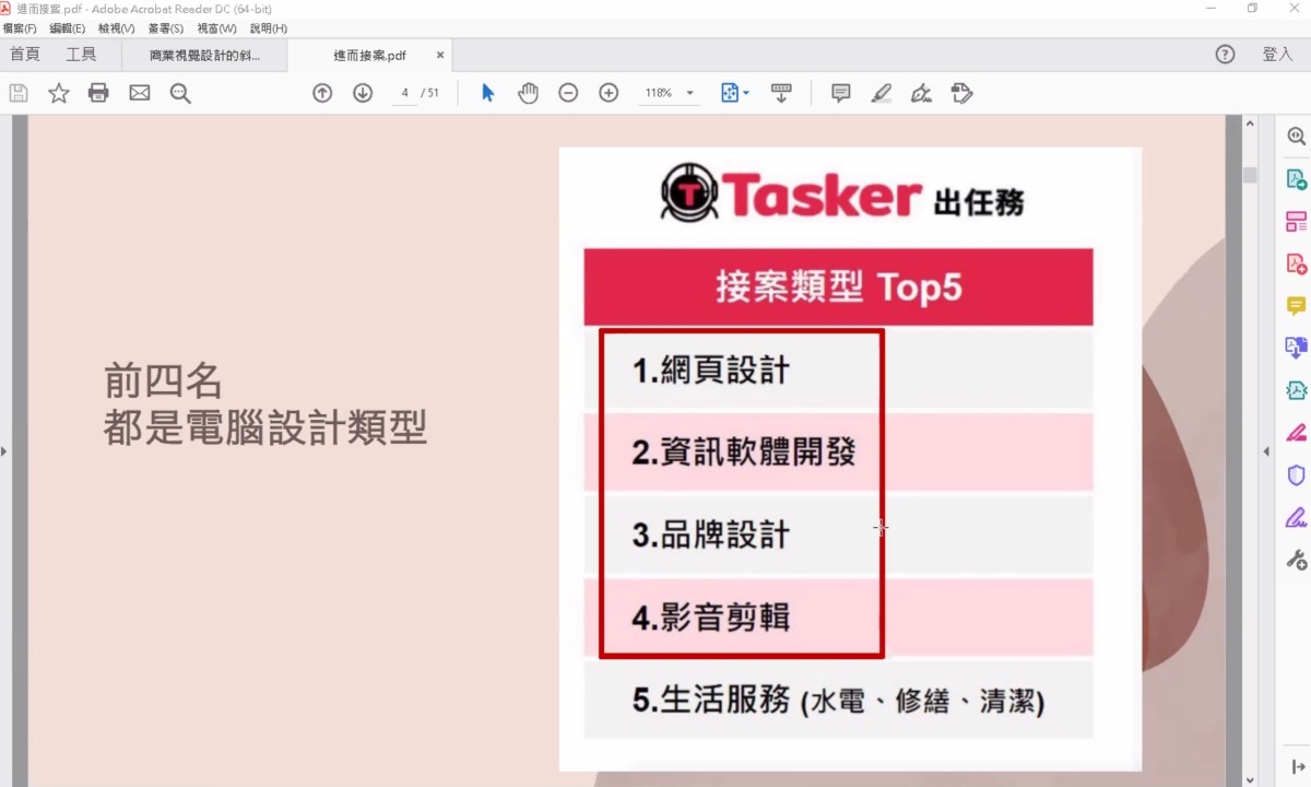 很多人現在想要進入商業設計的需求,我想不外乎都是想有個斜槓人生,額外接案,而在接案的最大宗需求裡,前五名裡,1~4 名都跟設計息息相關,像資訊軟體開發,不是跟寫程式有關係嗎?那就錯了,就算是開發 APP,最重要的是 UI/UX,而不是程式,沒有好的操作介面跟體驗,程式寫的再好都是枉然。