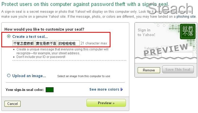 首頁 › 電腦小教室 › 你的奇摩安全圖章用了嗎?4個字不夠看,換個21個字吧! 你的奇摩安全圖章用了嗎?4個字不夠看,換個21個字吧! 發佈日期:2009/3/16 作者:阿湯 分類:電腦小教室 安全圖章就像上圖一樣,會出現在你的奇摩任何需要登入的頁面上,站長是不是打了15個字上去呢?咦!!奇摩不就只有4個字安全圖章或者是圖片嗎,很妙吧,只要1分鐘也就輕輕鬆鬆的解除4個字的限制,如果你還沒設定,沒關係,趕緊趁這個時候順便保護你的奇摩帳號吧! 何謂安全圖章? 因為現在非常多釣魚網站,像是拍賣網站最常見,利用假的奇摩登入頁面來騙取你的帳號,因此這個安全圖章會在你的電腦隨時跟著跑,只要出現奇摩登入頁面,他就會顯示在右上角,因此當你設定了安全圖章,卻沒有出現,那可能就是假的頁面囉! 如何設定安全圖章? 設定安全圖章的頁面: 請超級大力點我 到設定頁面後,有二種圖章可以設定,一種是文字,另一種為圖片,文字最多只能限制4個字(後面站長再教你〝升級21字〞哦)選擇完你要用的方式後,點擊預覽看一下效果吧! 在填入的時候有2格,一格表示上方2個字,第二格為下方2個字,出來的效果就像這樣,如果喜歡就按個儲存囉! 按下儲存後會出現一個提醒的視窗,二個圖示加一堆字其實只是要告訴你,安全圖章是針對電腦設定的,不是跟隨帳號,所以如果在別的常用電腦也必需要再設定一次,才能確保你帳號的安全哦。接下來趕緊來看看如何把安全圖章升級成21個字吧! 1分鐘將安全圖章快速升級21字: 其實說穿了也沒什麼,因為美國的單字,一個字就很多字元,因此在外國的安全圖章是21個字元可填,所以我們只要在美國的奇摩設定安全圖章,就可以有三行21個字元可以設定囉,步驟和上面的都一樣。 看吧,有好多字了,在跳回台灣的奇摩,效圖都是一樣的,這樣的安全圖章不管是哪一國的奇摩入口都是會出現的,非常安全,但安全圖章不在於字數多少,在於有沒有設定啦,老師說,帳號要好好保護,你有在聽嗎?快去加個小圖章吧!