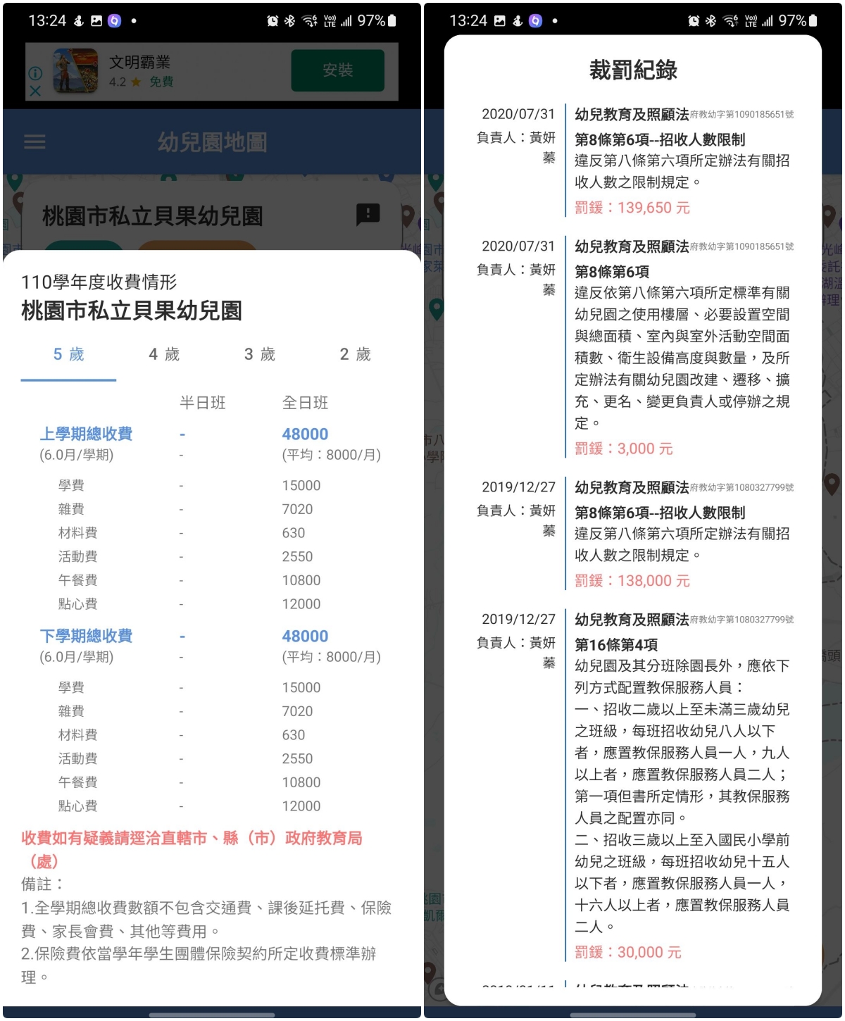 點擊收費及裁罰記錄,就可以看到更細的項目,以收費來說,幼兒園會區分 2~5 歲不同班別的費用細項,而裁罰紀錄也能看到詳細的違規項目,像阿湯隨便點一家來看,這家主要都是招收人數或師生比問題,在意的就可以考量一下,用這樣的方式去找,就可以省下不少時間哦。