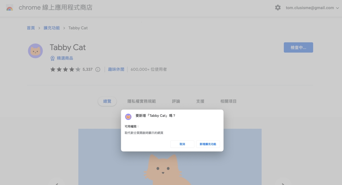 首頁 › 電腦軟體 › Tabby Cat - 超廢的 Chrome 外掛,新開分頁就是貓,貓奴專用 Tabby Cat - 超廢的 Chrome 外掛,新開分頁就是貓,貓奴專用 發佈日期:2022/6/19 作者:阿湯 分類:電腦軟體 很久沒介紹個超廢的小工具,這個叫做 Tabby Cat,是 Chrome 瀏覽器的擴充套件,到底有多廢呢?簡單的說,他就是個觀賞用的東西,不具任何實質的功能,但認真來說也算是有實質的功能吧,對貓奴來說,一開啟分頁就能看到一隻可愛的貓應該是很療癒的一件事,而且不只是貓,還有很多動物可以替換,其實也還算是不錯啦,貓奴們還不手刀裝起來。 Chrome 擴充套件 - Tabby Cat 官方網站:https://tabbycats.club/ Chrome 應用商店:請點我前往 直接先加到你的 Chrome 瀏覽器上吧。 接下來什麼都不用做,只要開啟新分頁,就可以看到一隻貓,而點擊右上角的相機圖示可以截圖,因為這貓不是固定的,他是會有一些表情跟動作變化,覺得可愛就可以截圖留存下來。 點擊左上角可以切換不同的動物,還有像是狗狗、企鵝、豹、小熊、烏龜等,其實每次開新分頁都可以看到還蠻療癒的啦。
