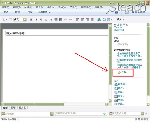 當你重灌之後你會發現WLW的右邊都不見了,那是因為你沒有備份最近張貼的文章,也沒有備份草稿,此時我們就按下〝其他〞叫回網站的文章吧!