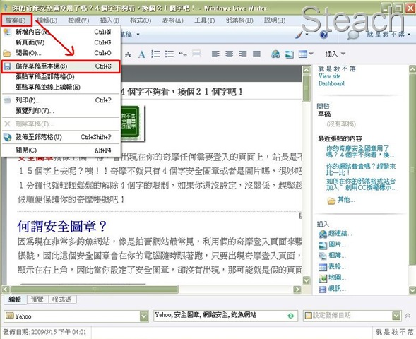 檔案→儲存草稿至本機(其實儲存草稿就是備份,但發表了文章也是備份)