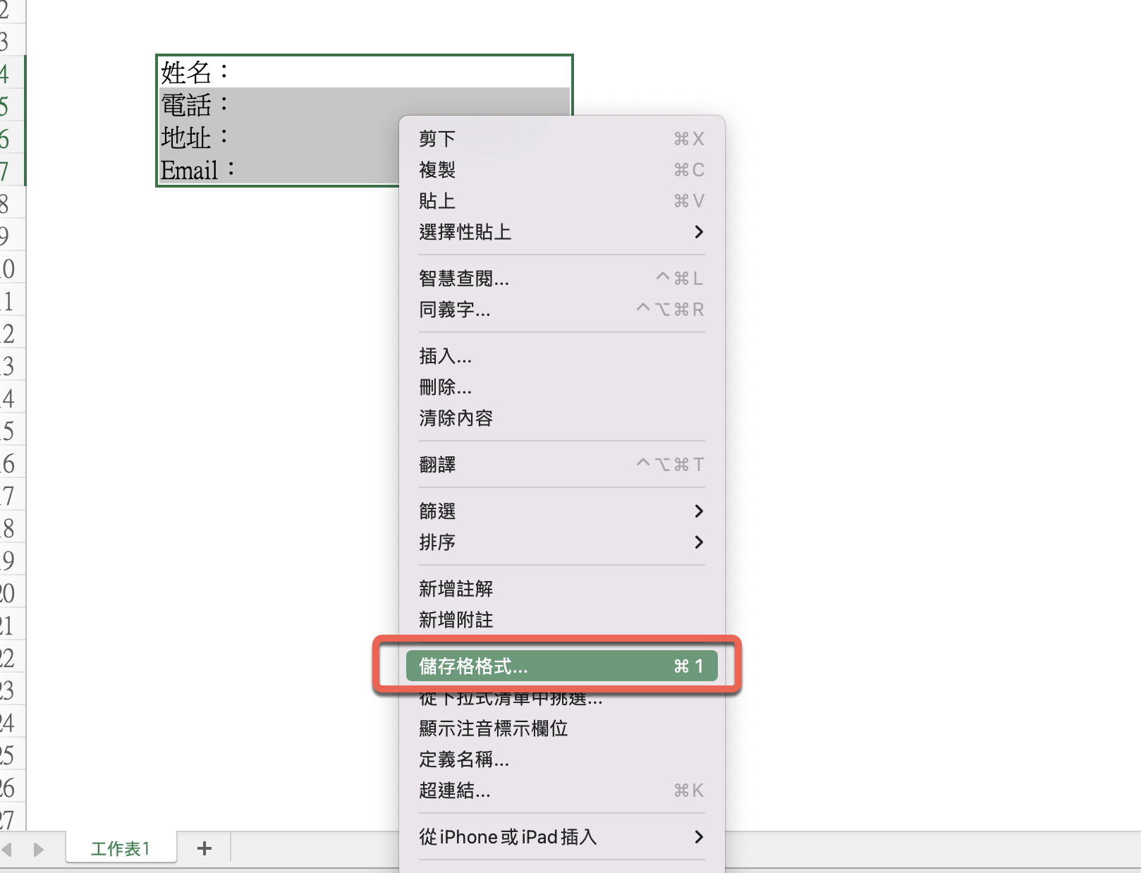 這時我們可以換這樣的做法,直接把要加入下底線的欄位全部都選起來,然後右鍵進入儲存格格式。