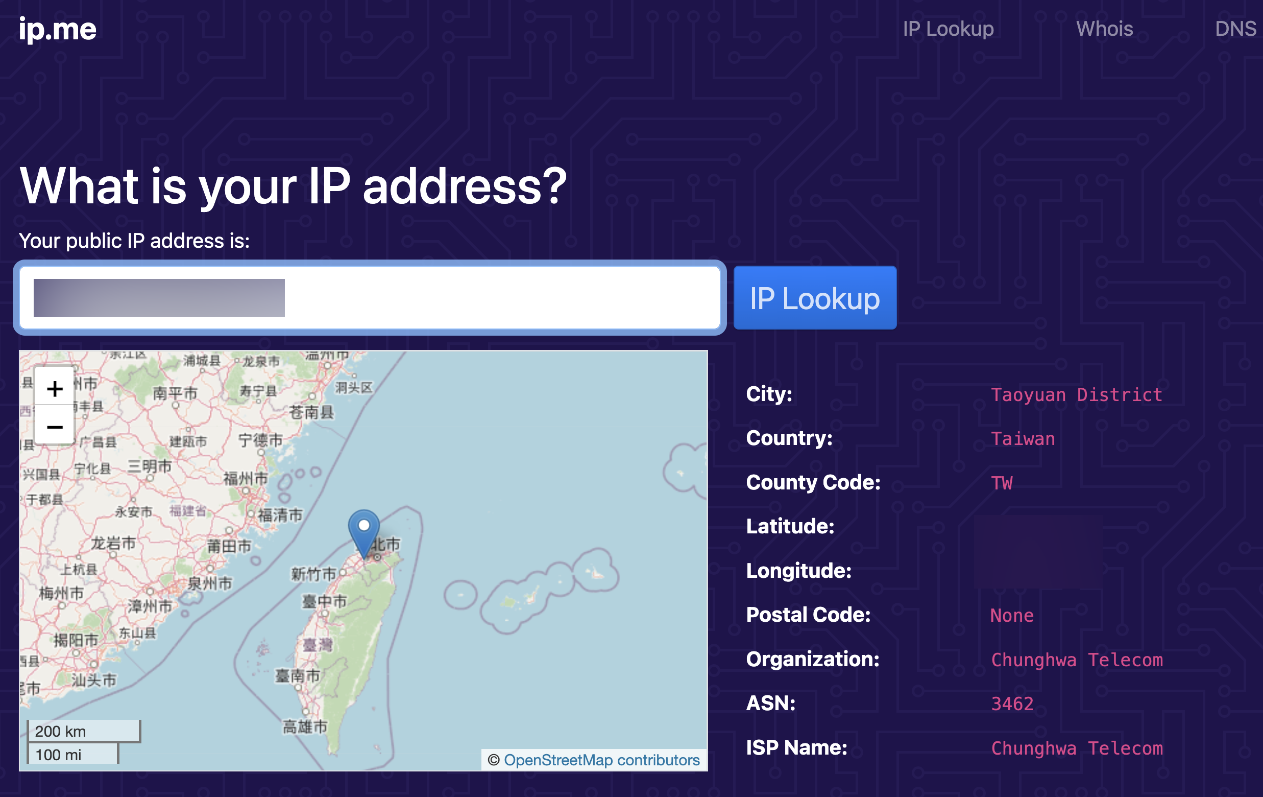 網站:https://ip.me/基本上進入網站後,就會自動顯示你目前設備所連接的 IP 位置資訊,包括地理位置、電信業者等基本資訊,這個地理位置也是大約估算,並不是真的會精準到什麼 10 公尺那種,通常誤差值從幾百公尺到數公里都有可能,除了直接偵測你的 IP 之外,你也可以手動自行輸入 IP 反查位置在哪裡。